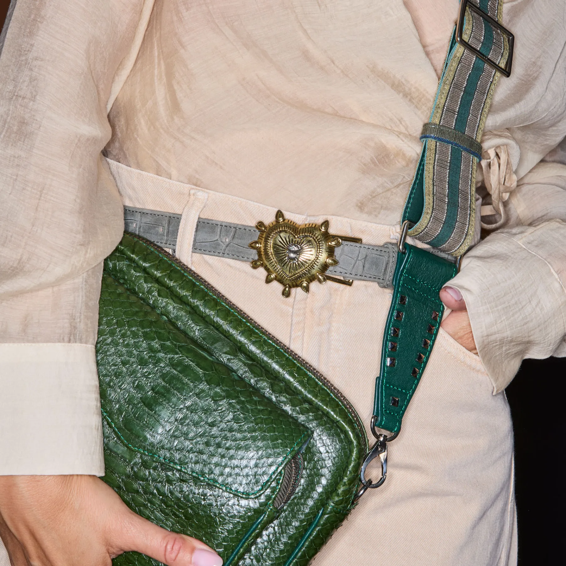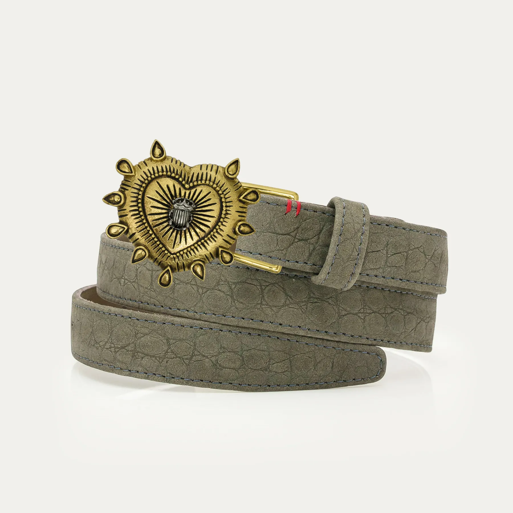 Ce ceinturon plus fin, doublé de cuir, est orné d’une magnifique boucle en laiton avec un ex-voto au milieu. Il ajoute une touche distinctive aux tenues les plus simples et se porte aussi bien sur un jean que sur une robe.