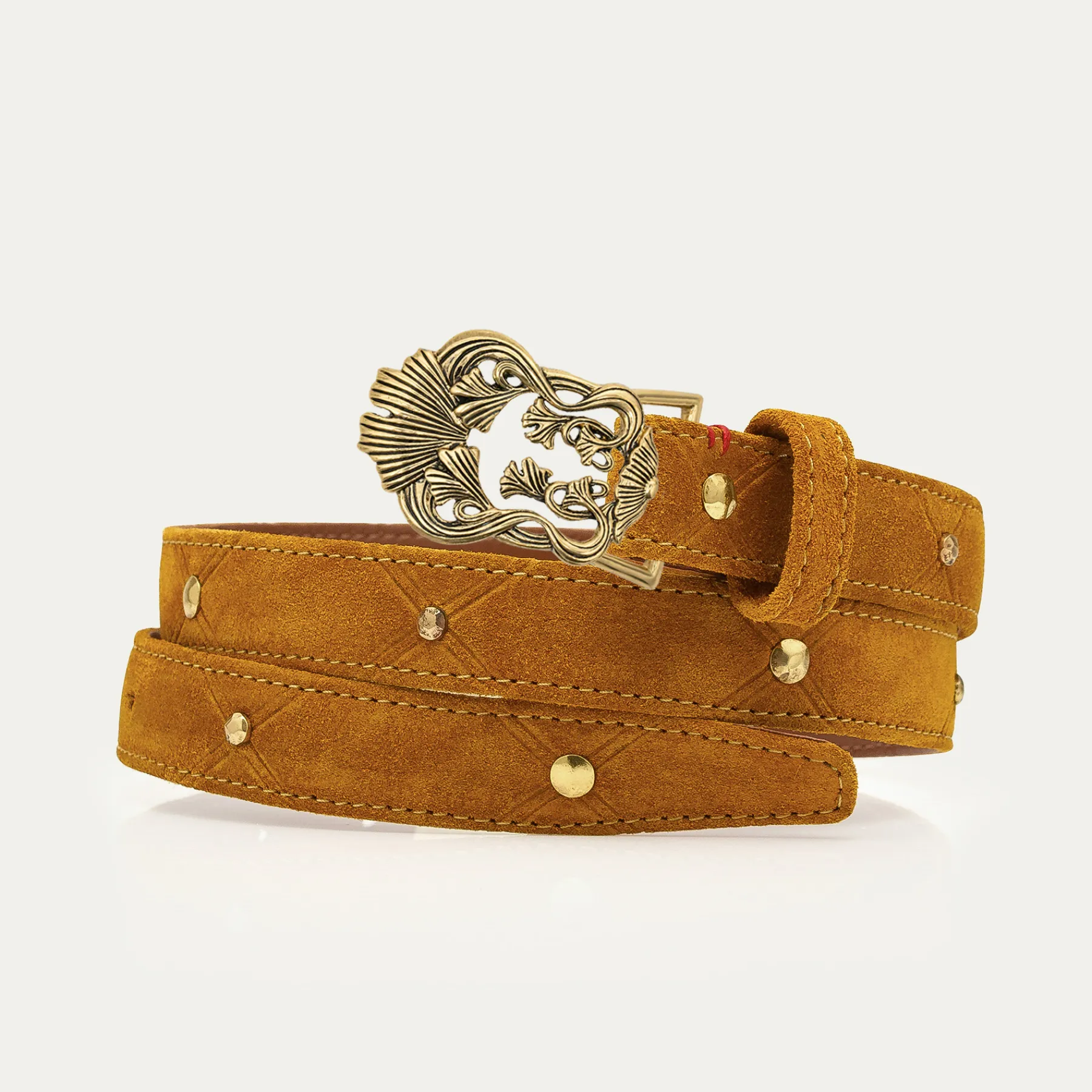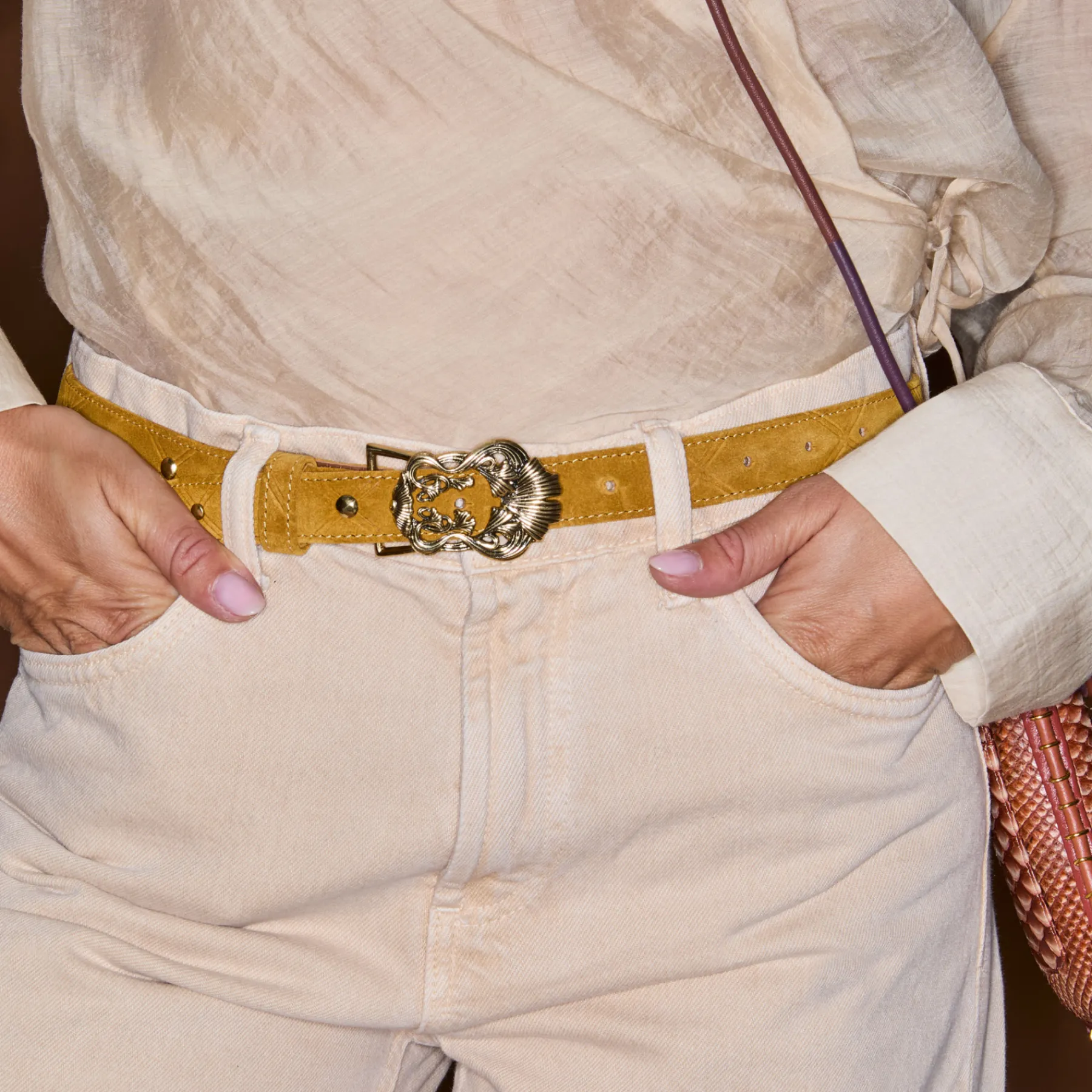 Ce ceinturon plus fin, en python, doublé de cuir, est orné d’une magnifique boucle en laiton en forme de feuille de gi…