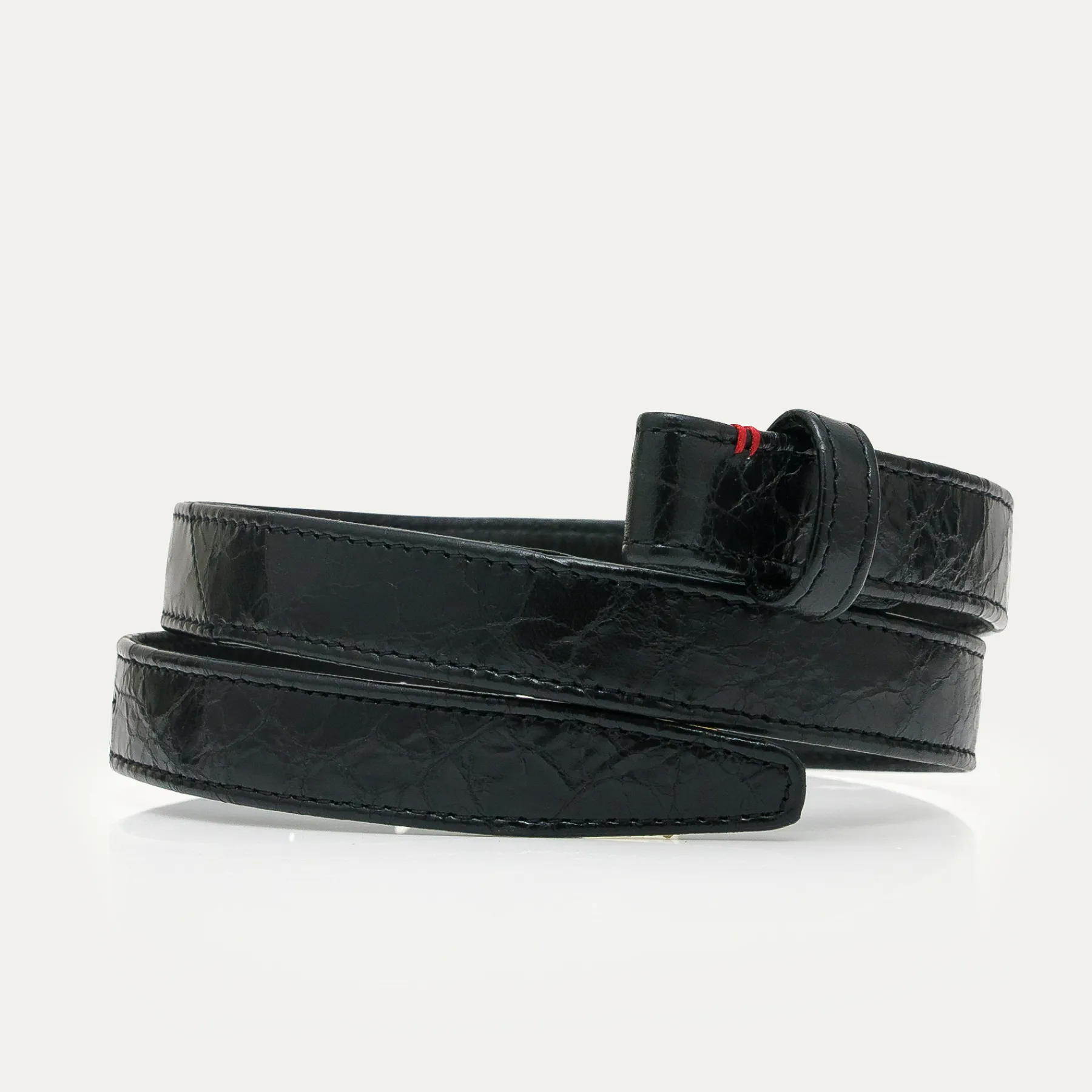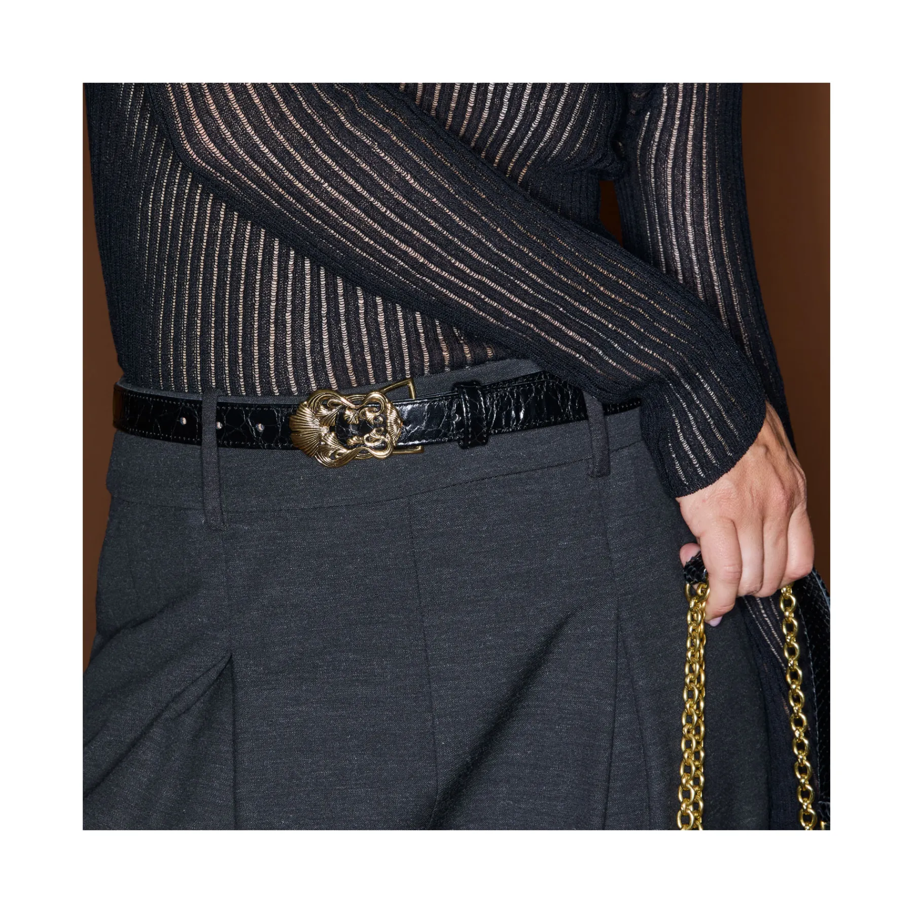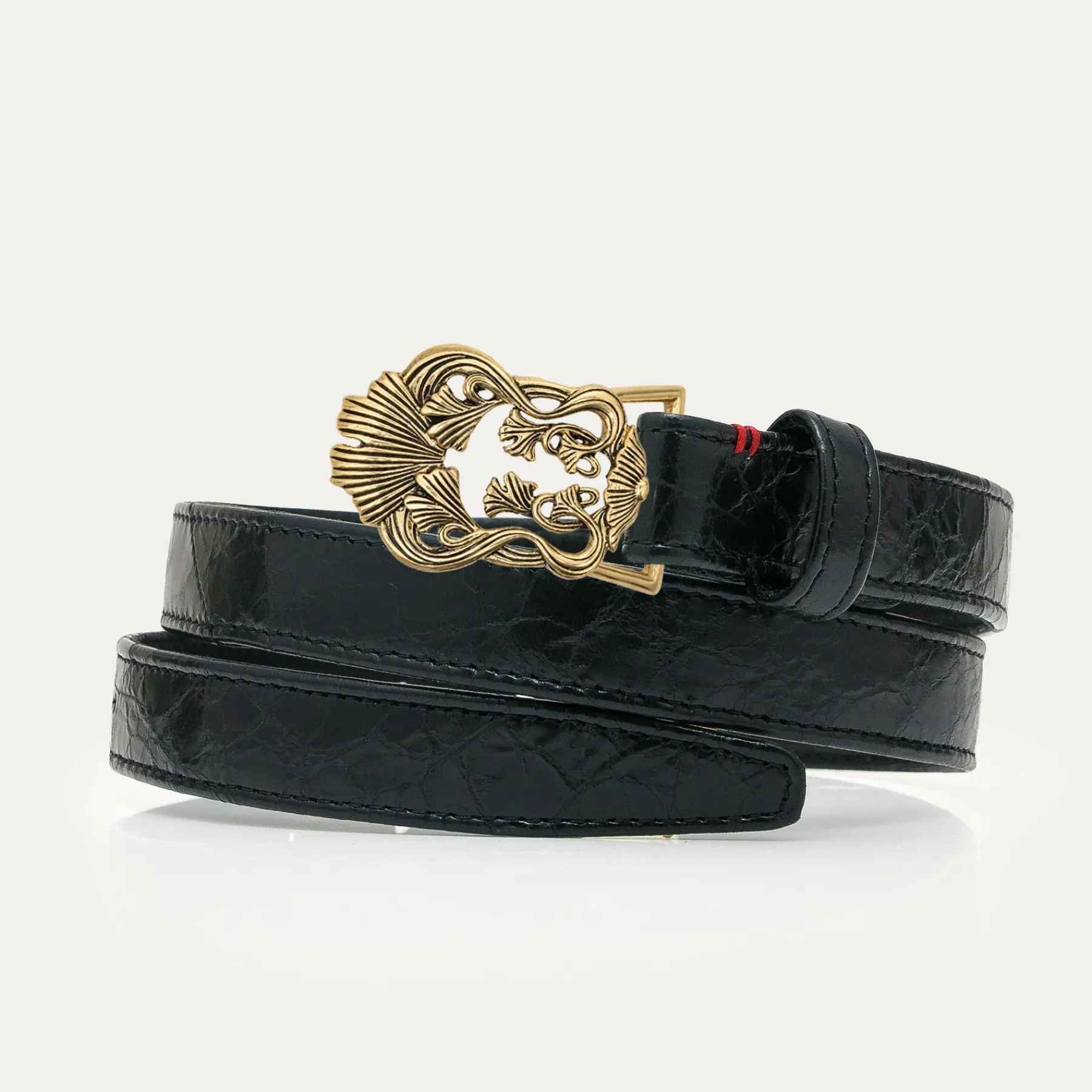 Ce ceinturon plus fin, en python, doublé de cuir, est orné d’une magnifique boucle en laiton en forme de feuille de ginkgo. Elle donne un look fort aux tenues les plus simples et se porte aussi bien sur un jean que sur une robe.