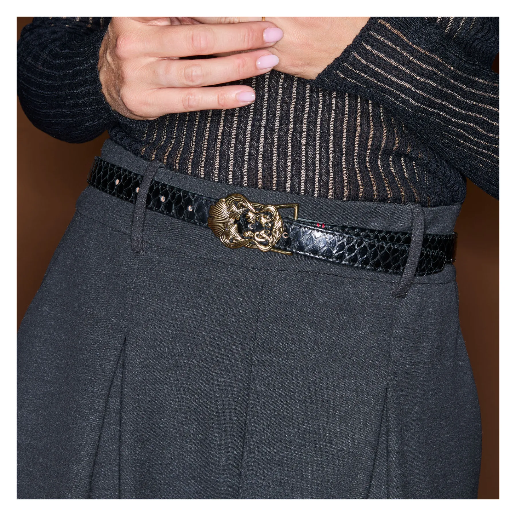 Ce ceinturon plus fin, en python, doublé de cuir, est orné d’une magnifique boucle en laiton en forme de feuille de gi…