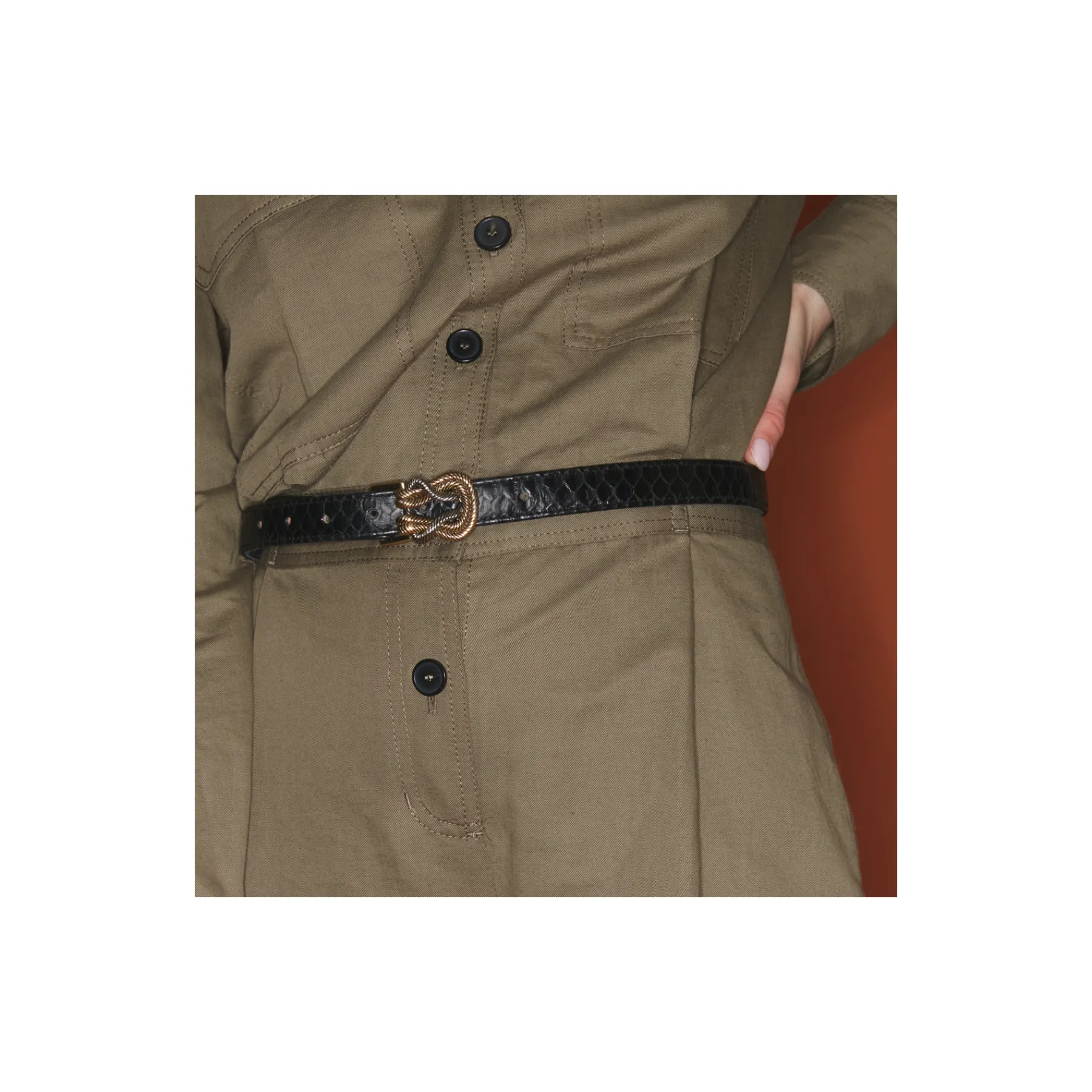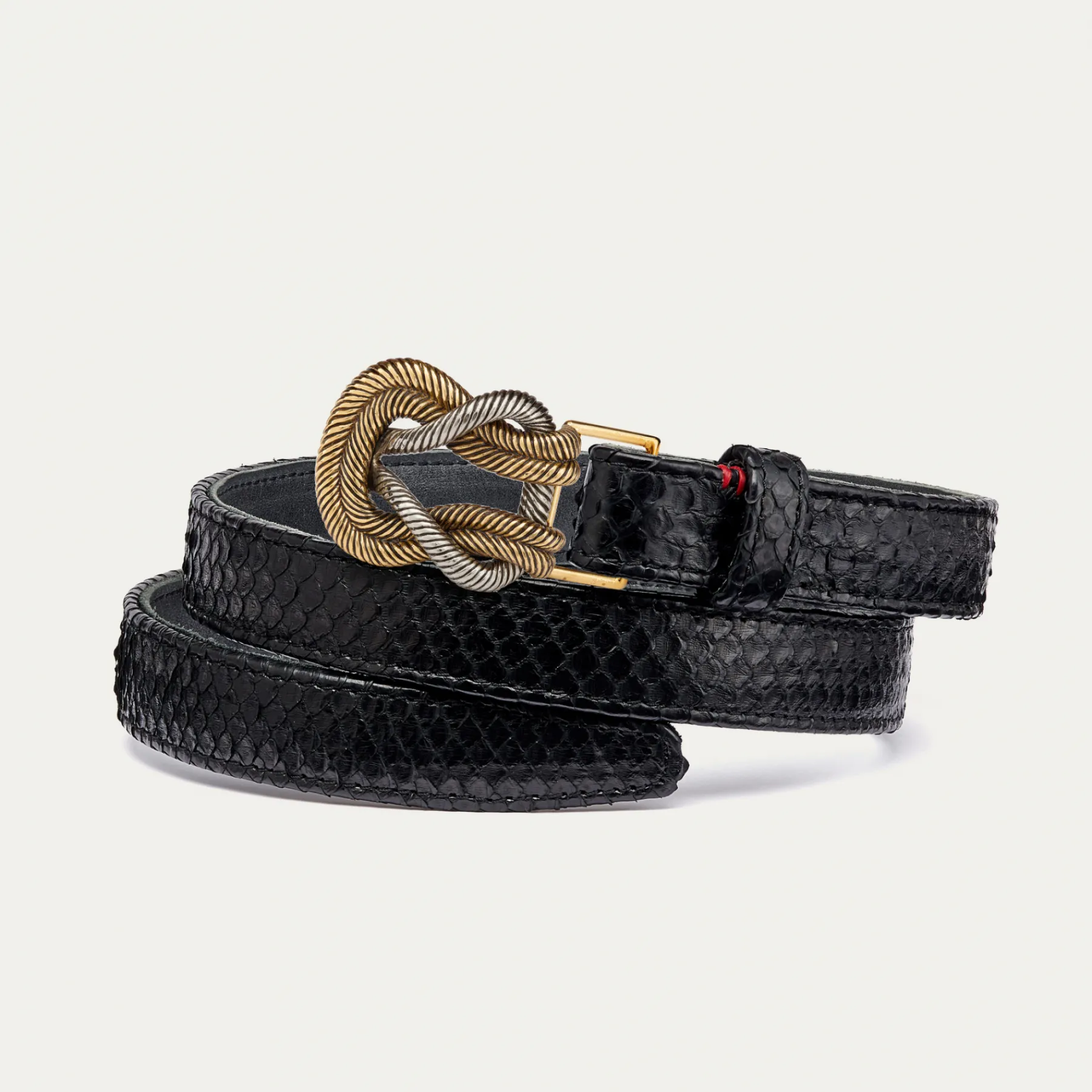 Ce ceinturon plus fin en python, doublé de cuir, est orné d’une magnifique boucle ovale en forme de noeud et en laiton. Elle donne un look fort aux tenues les plus simples et se porte aussi bien sur un jean que sur une robe.
