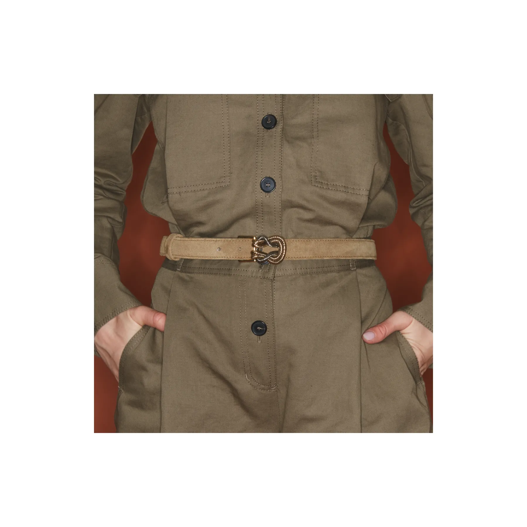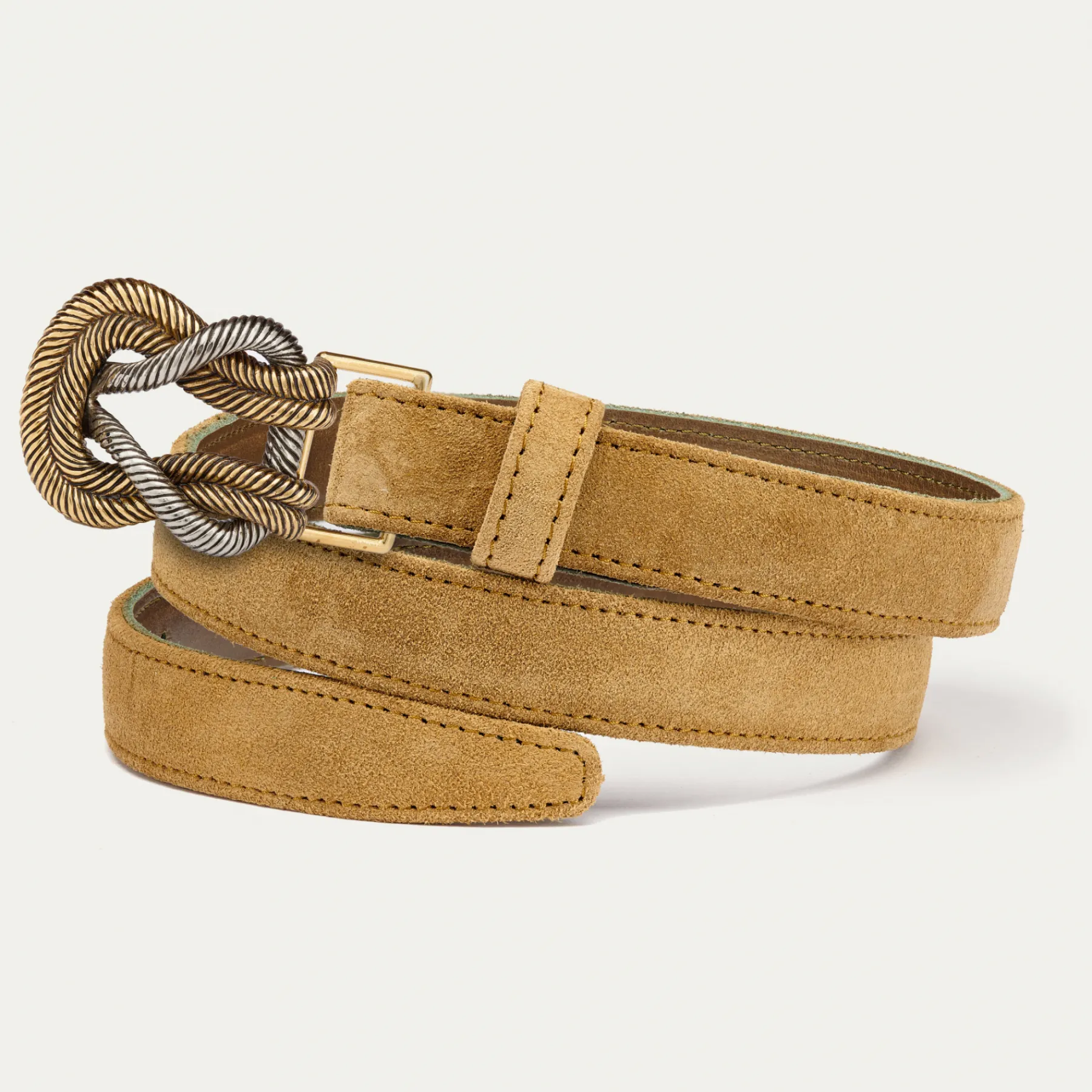 Ce ceinturon, doublé de cuir, est orné d’une magnifique boucle ovale en forme de noeud et en laiton. Elle donne un look fort aux tenues les plus simples et se porte aussi bien sur un jean que sur une robe.