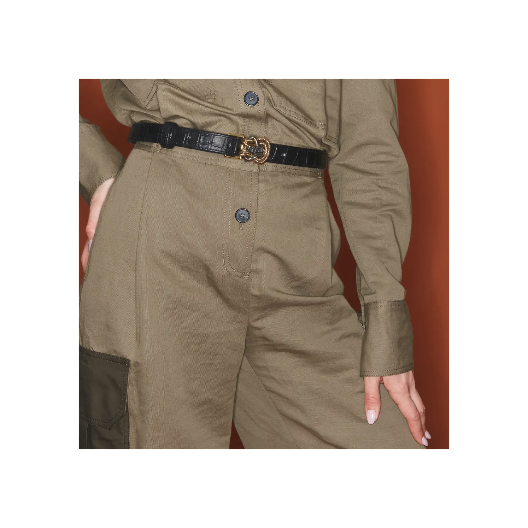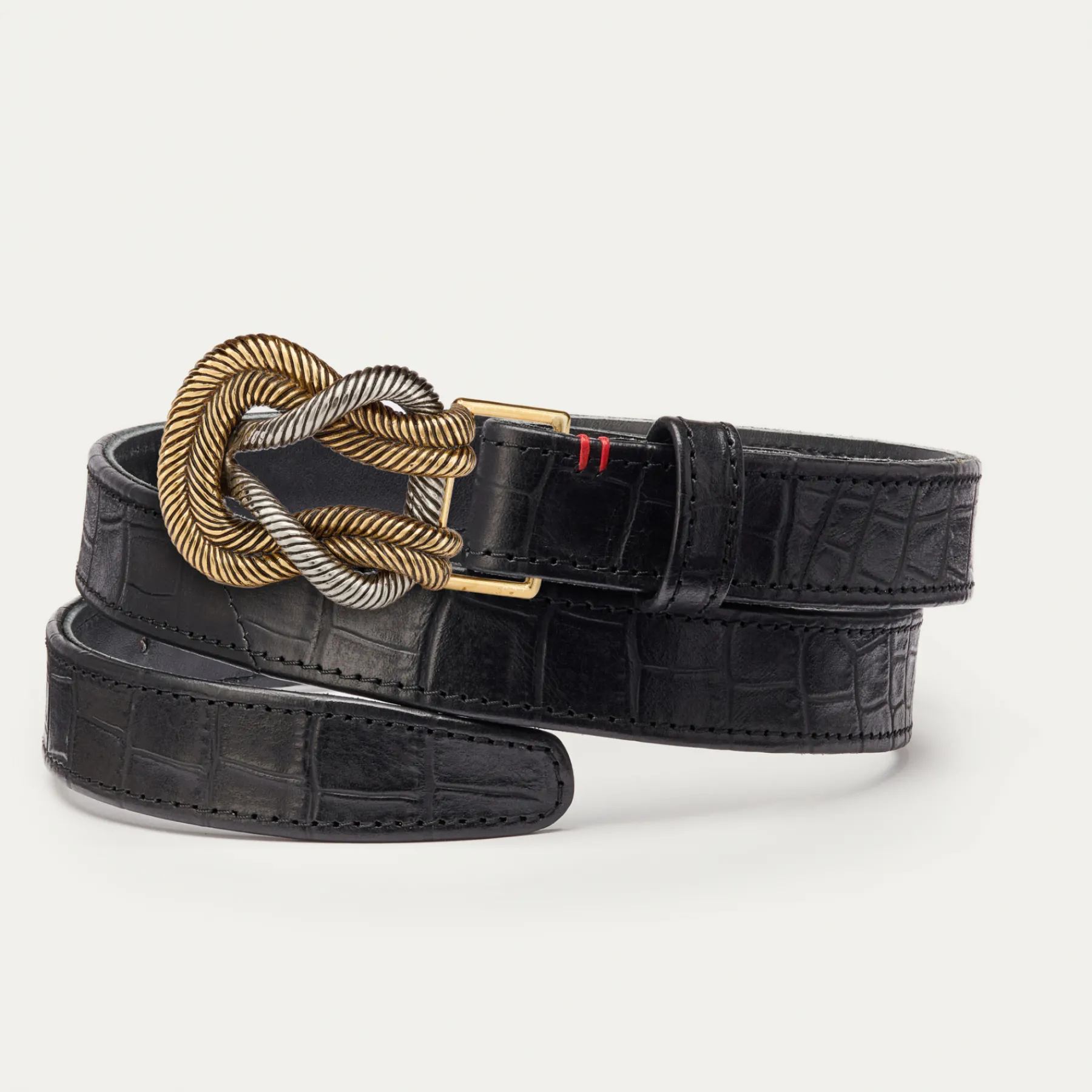 Ce ceinturon, doublé de cuir, est orné d’une magnifique boucle ovale en forme de noeud et en laiton. Elle donne un look fort aux tenues les plus simples et se porte aussi bien sur un jean que sur une robe.