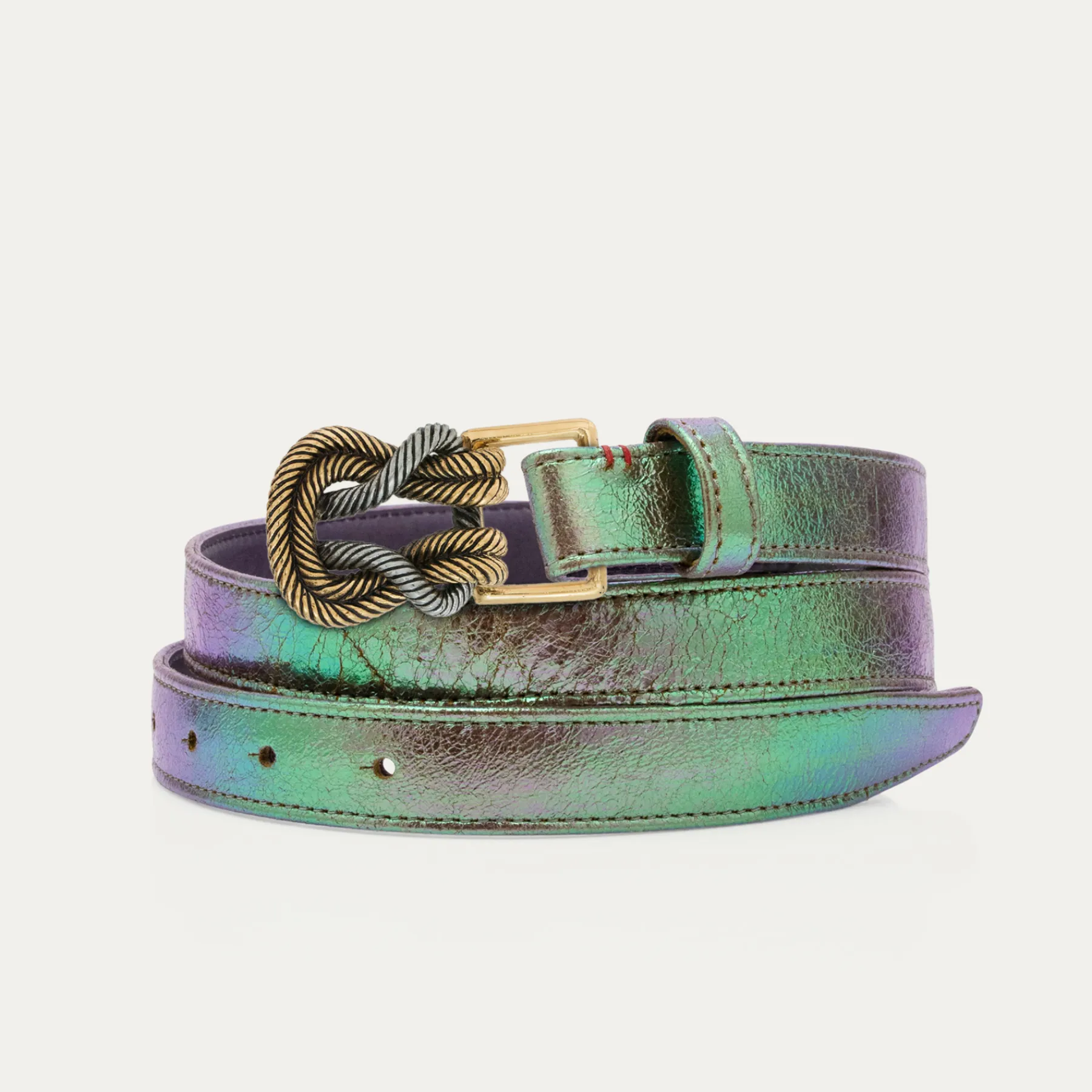 Ce ceinturon, doublé de cuir, est orné d’une magnifique boucle ovale en forme de noeud et en laiton. Elle donne un look fort aux tenues les plus simples et se porte aussi bien sur un jean que sur une robe.