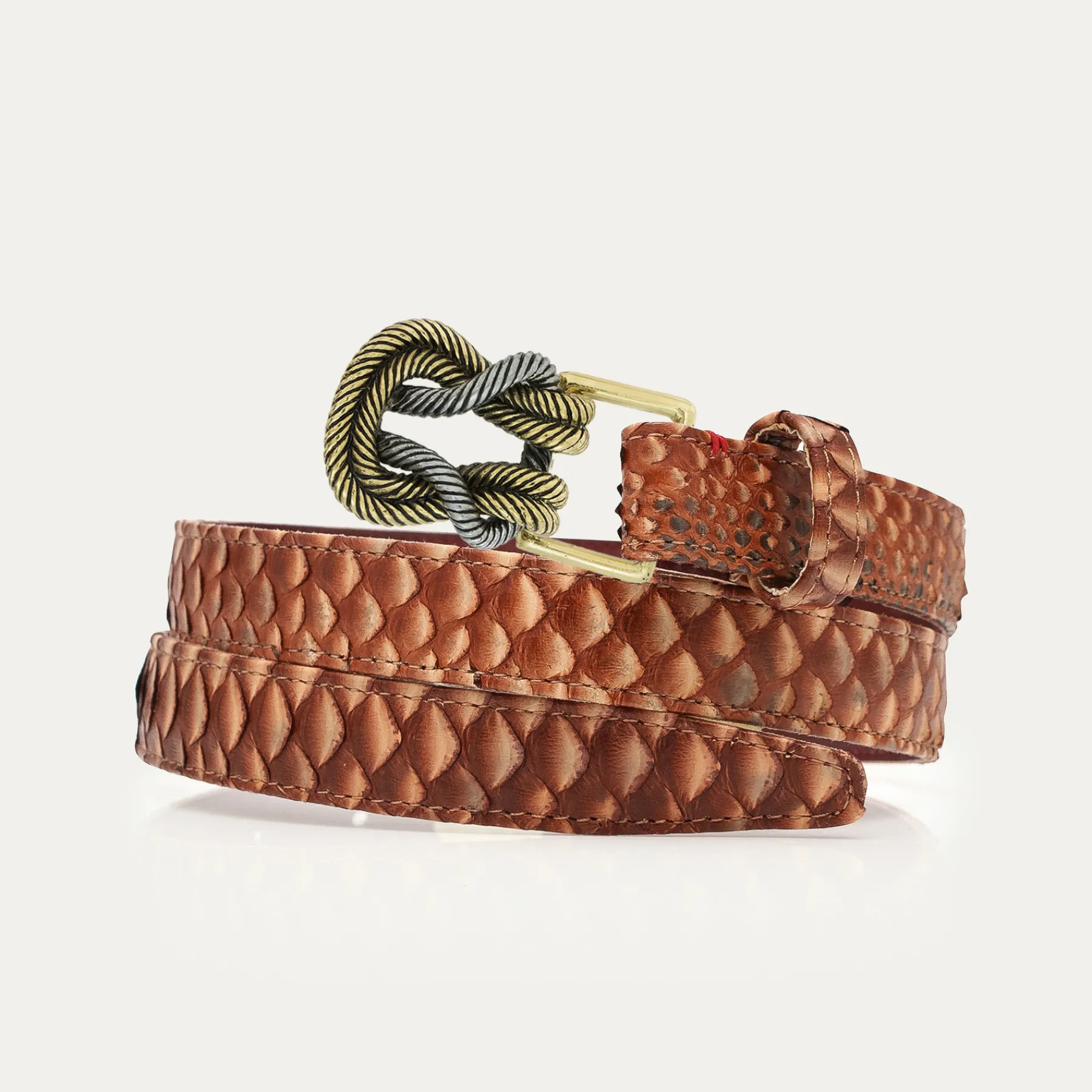 Ce ceinturon plus fin en python, doublé de cuir, est orné d’une magnifique boucle ovale en forme de noeud et en laiton. Elle donne un look fort aux tenues les plus simples et se porte aussi bien sur un jean que sur une robe.