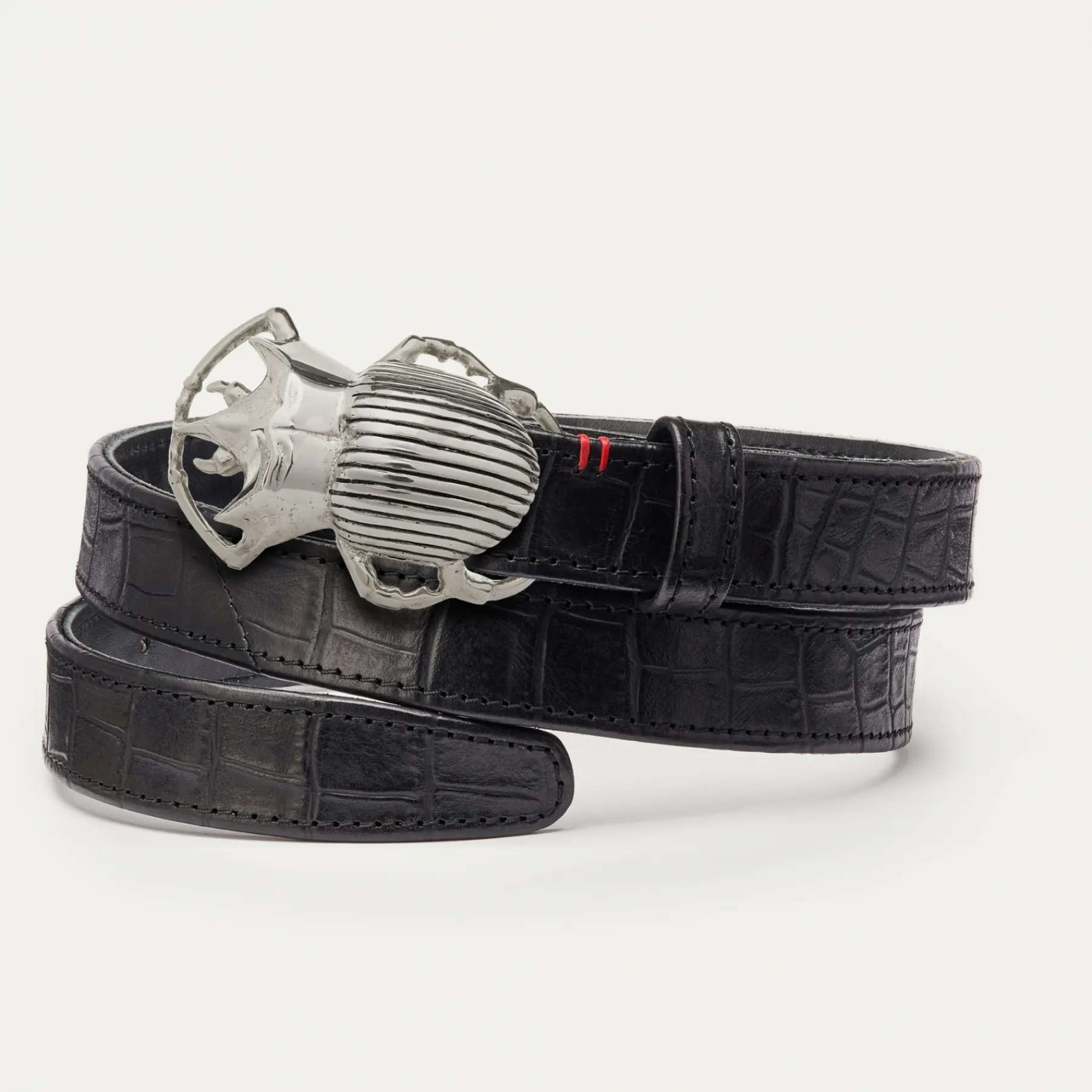 Ce ceinturon plus fin en python est doublé de cuir et orné d’une magnifique boucle en forme de scarabée. Elle donne un look fort aux tenues les plus simples.