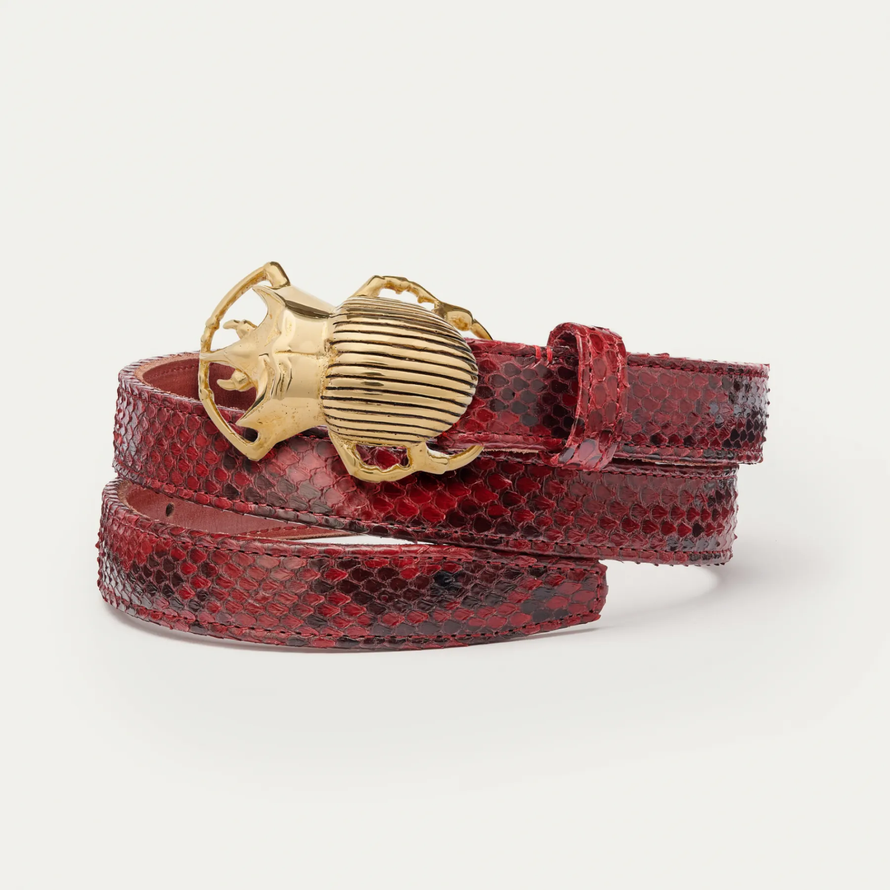 Ce ceinturon plus fin en python est doublé de cuir et orné d’une magnifique boucle en forme de scarabée. Elle donne un look fort aux tenues les plus simples.