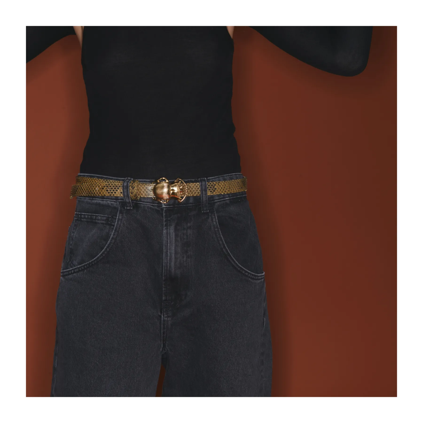 Ce ceinturon plus fin en python est doublé de cuir et orné d’une magnifique boucle en forme de scarabée. Elle donne un look fort aux tenues les plus simples.