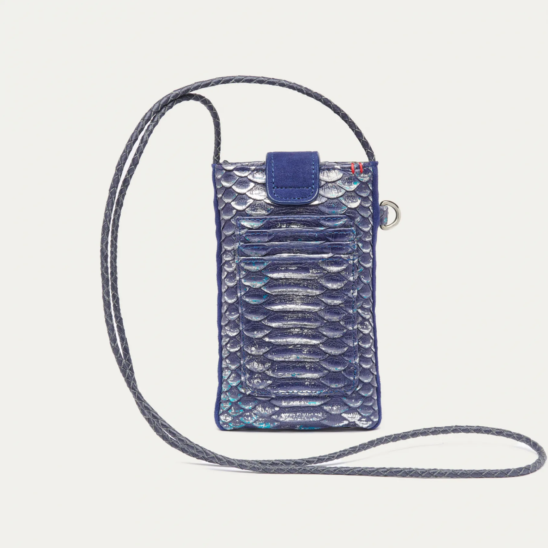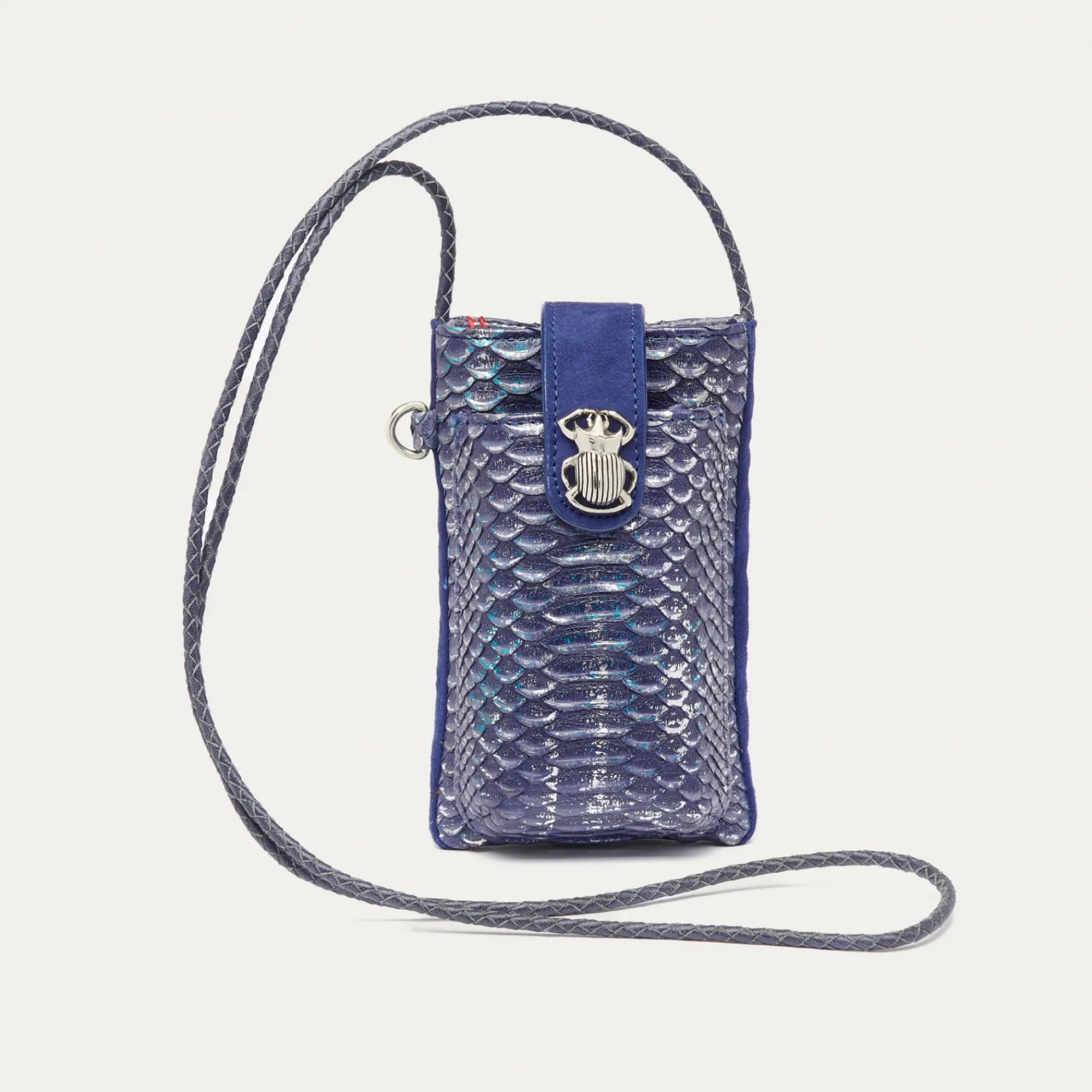 Cet étui en python et cuir suédé conçue afin de transporter votre téléphone est réalisée à la main. Le double Marcus est doté de deux compartiments. La poche principale vous permettra d’accueillir votre smartphone et la poche avant vos lunettes. Ces deux poches se ferment à l’aide d’un rabat aimanté, orné d’un scarabée argenté. À l’arrière, 3 fentes vous permettront d’y ranger vos différentes cartes.