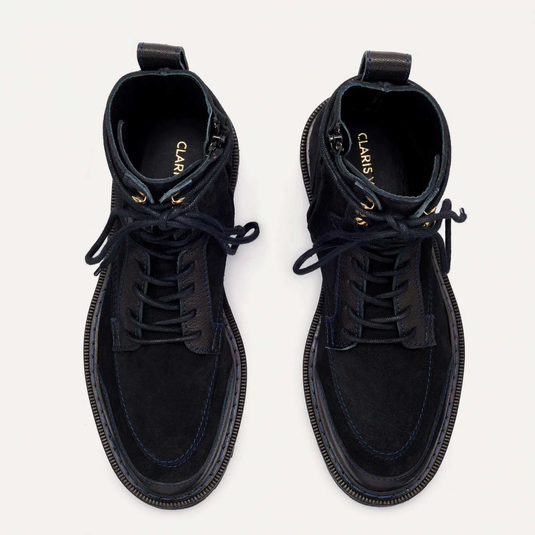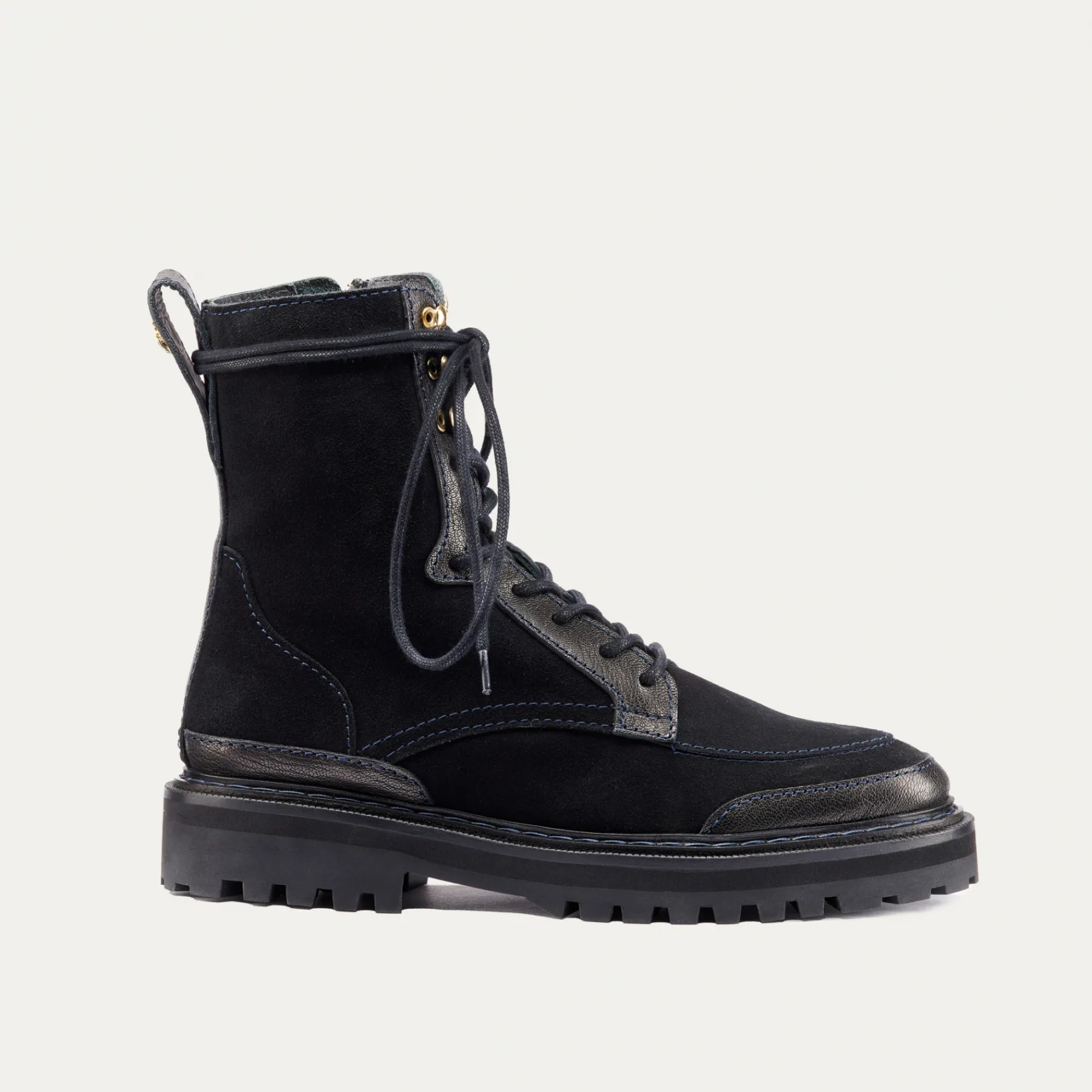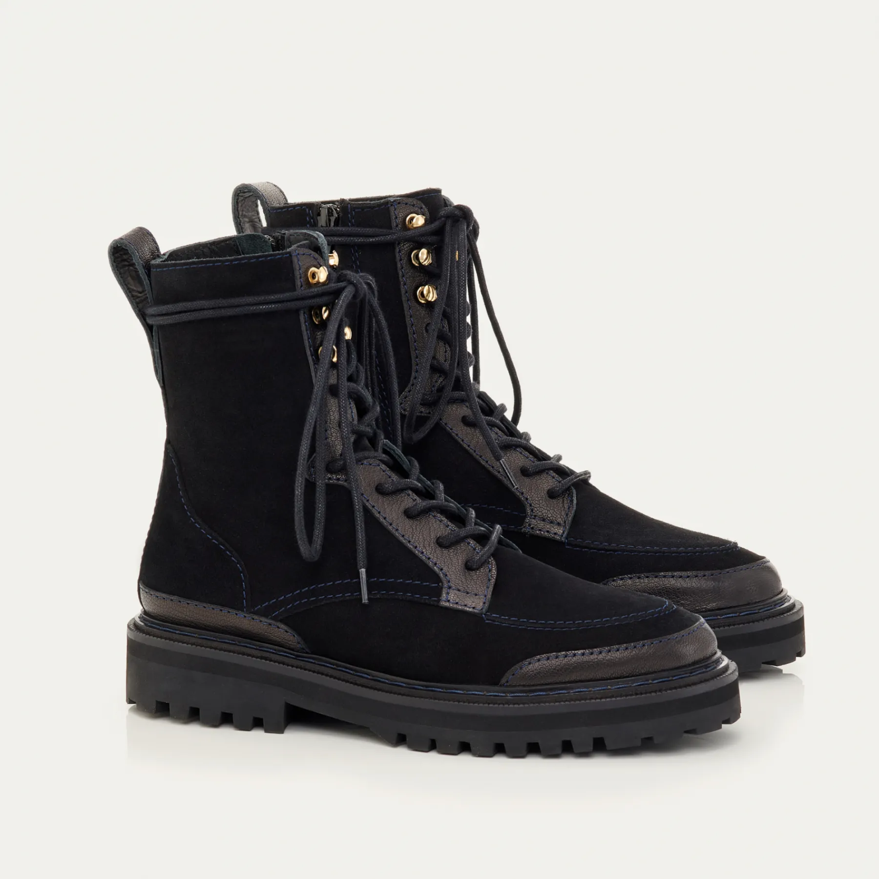 Nos nouvelles boots à lacets Noa sauront vous accompagner tout l’été grâce à leur souplesse et légèreté. À la fois simples et modernes, ces nouvelles bottines apporteront une touche rock à vos tenues les plus classiques. Confectionnées au Portugal en veau velours, la bottine repose sur une épaisse semelle crantées de 3,5 cm en caoutchouc et possède un zip côté intérieur.