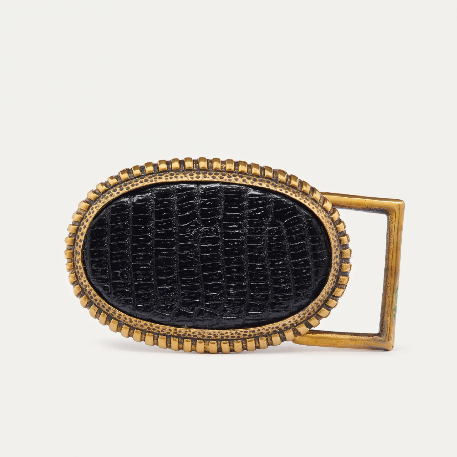 Ce ceinturon en python, doublé de cuir, est orné d’une magnifique boucle ovale en laiton dans laquelle est incrustée un morceau de peau assorti avec la couleur de la ceinture. Elle donne un look fort aux tenues les plus simples et se porte aussi bien sur un jean que sur une robe.
