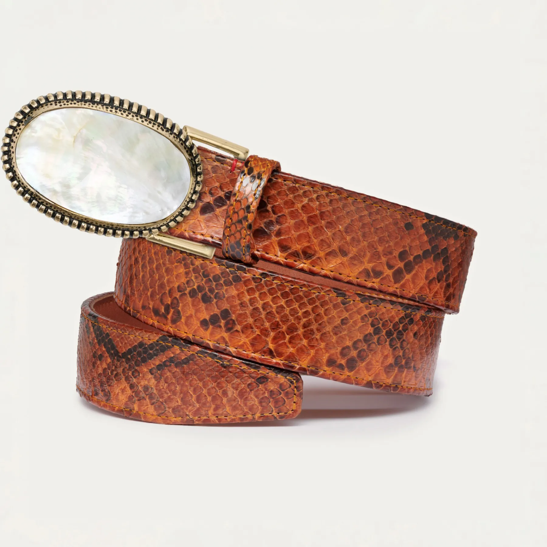 Ce ceinturon en python, doublé de cuir, est orné d’une magnifique boucle ovale en laiton dans laquelle est incrustée un morceau de peau assorti avec la couleur de la ceinture. Elle donne un look fort aux tenues les plus simples et se porte aussi bien sur un jean que sur une robe.