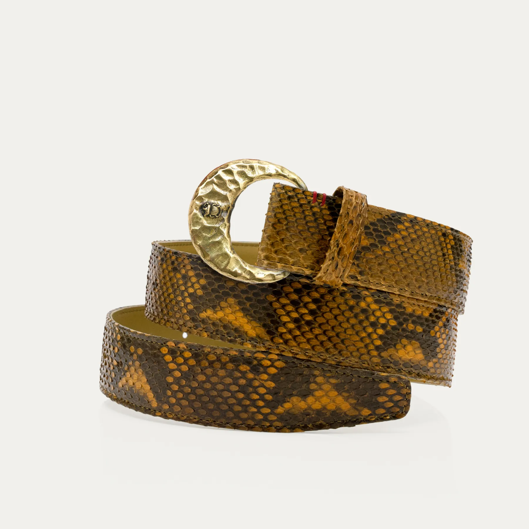Ce ceinturon en python, doublé de cuir, est orné d’une magnifique boucle en laiton en forme de demi-lune. Elle donne u…