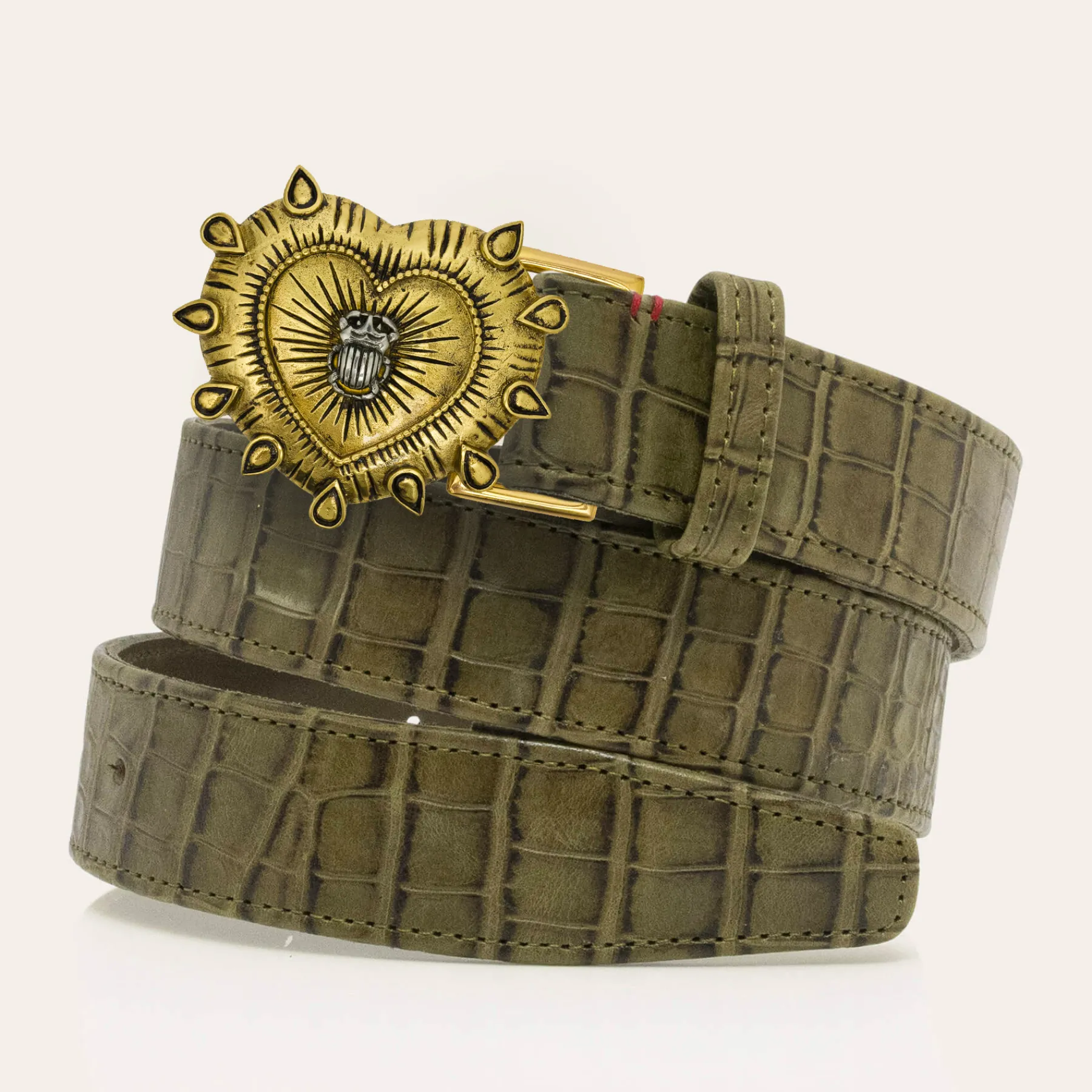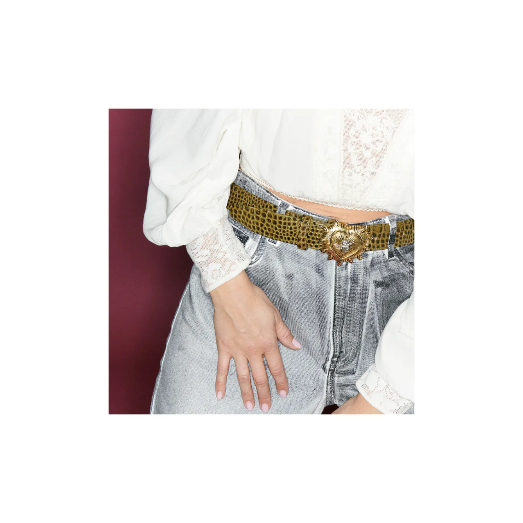 Ce ceinturon, doublé de cuir, est orné d’une magnifique boucle ex-voto. Elle donne un look fort aux tenues les plus simples et se porte aussi bien sur un jean que sur une robe.