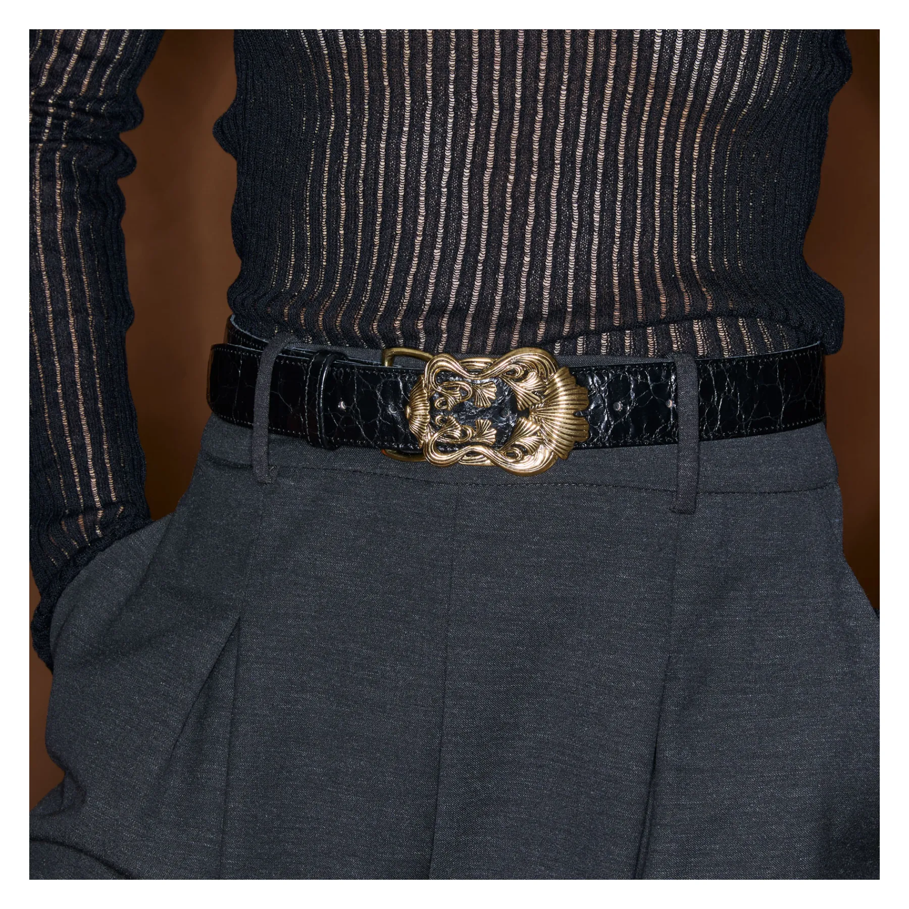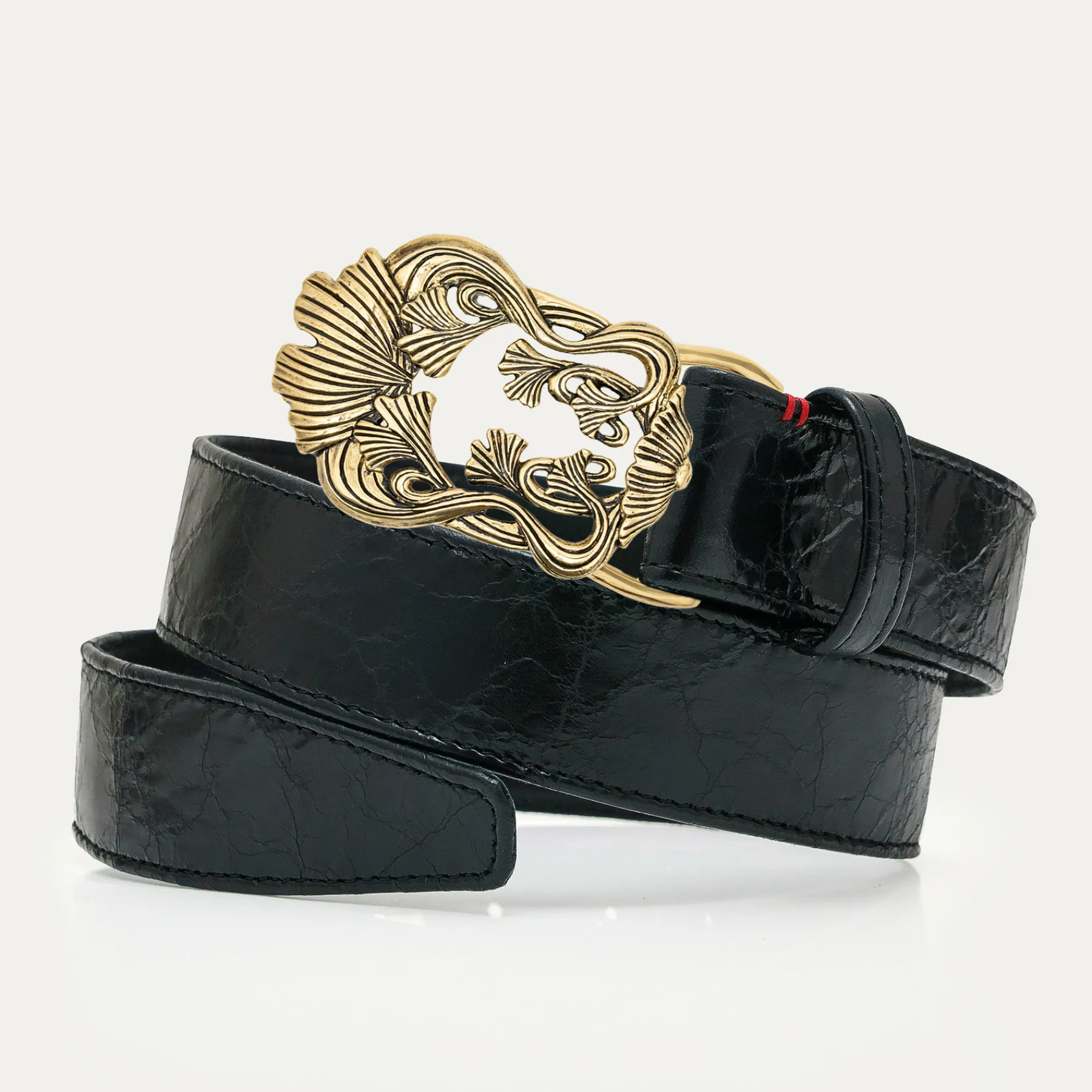 Ce ceinturon, en python, doublé de cuir, est orné d’une magnifique boucle en laiton en forme de Feuille de Ginko. Elle donne un look fort aux tenues les plus simples et se porte aussi bien sur un jean que sur une robe.