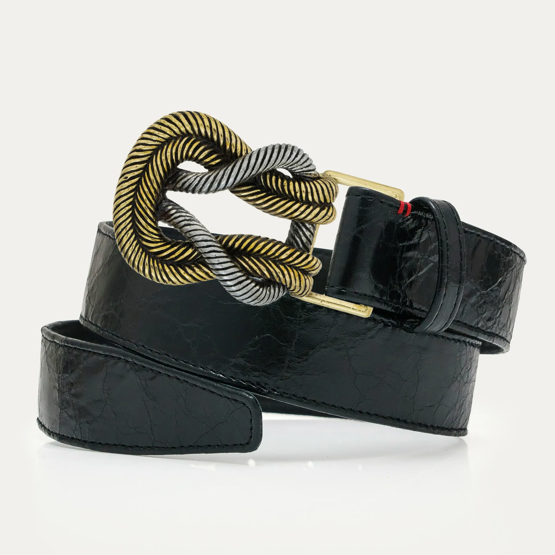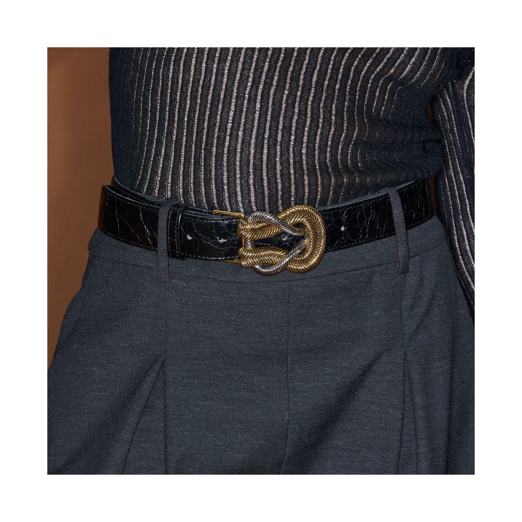 Ce ceinturon, doublé de cuir, est orné d’une magnifique boucle ovale en forme de noeud et en laiton. Elle donne un look fort aux tenues les plus simples et se porte aussi bien sur un jean que sur une robe.