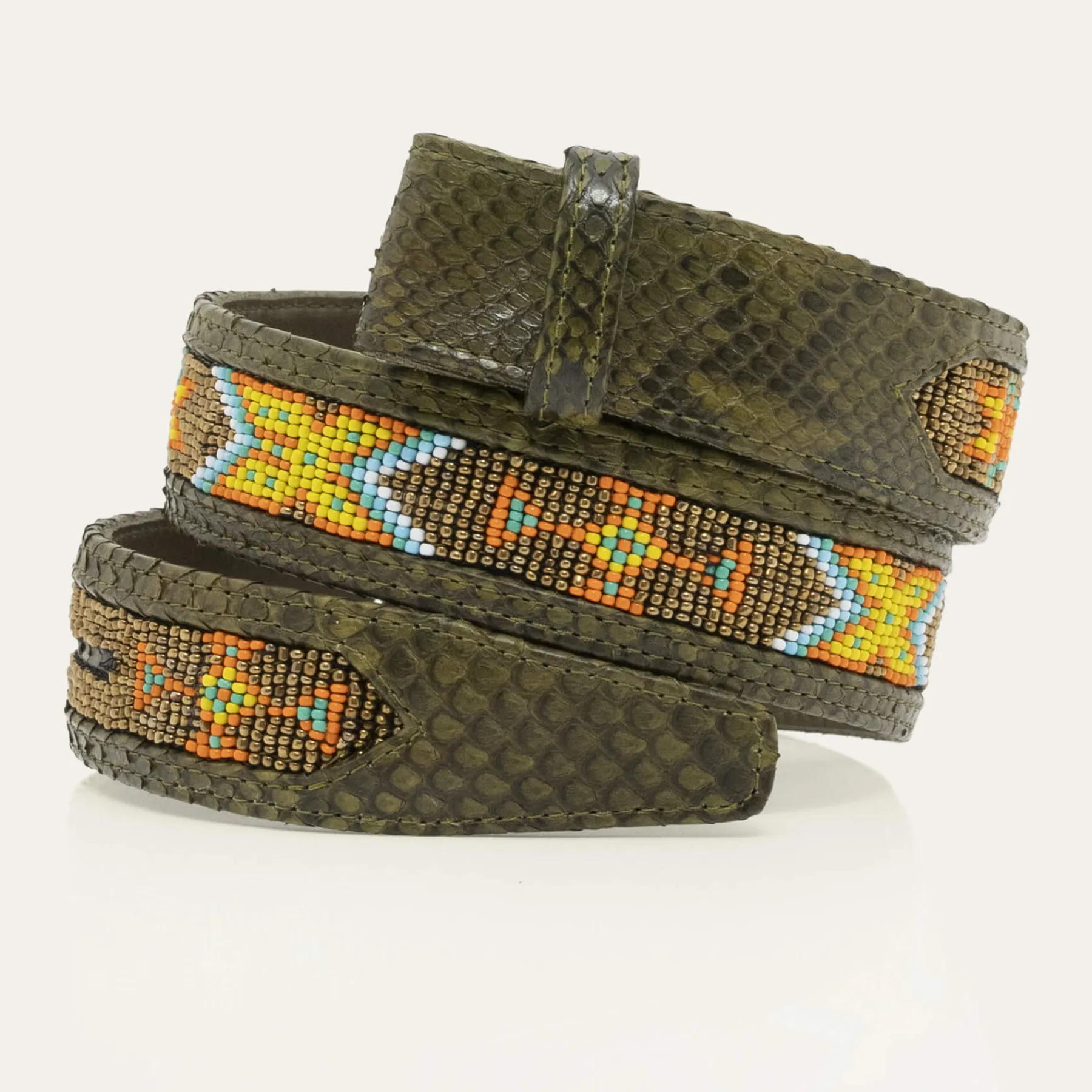Ce ceinturon en python, doublé de cuir, est orné d’une magnifique boucle ovale en forme de noeud et en laiton. Elle donne un look fort aux tenues les plus simples et se porte aussi bien sur un jean que sur une robe.