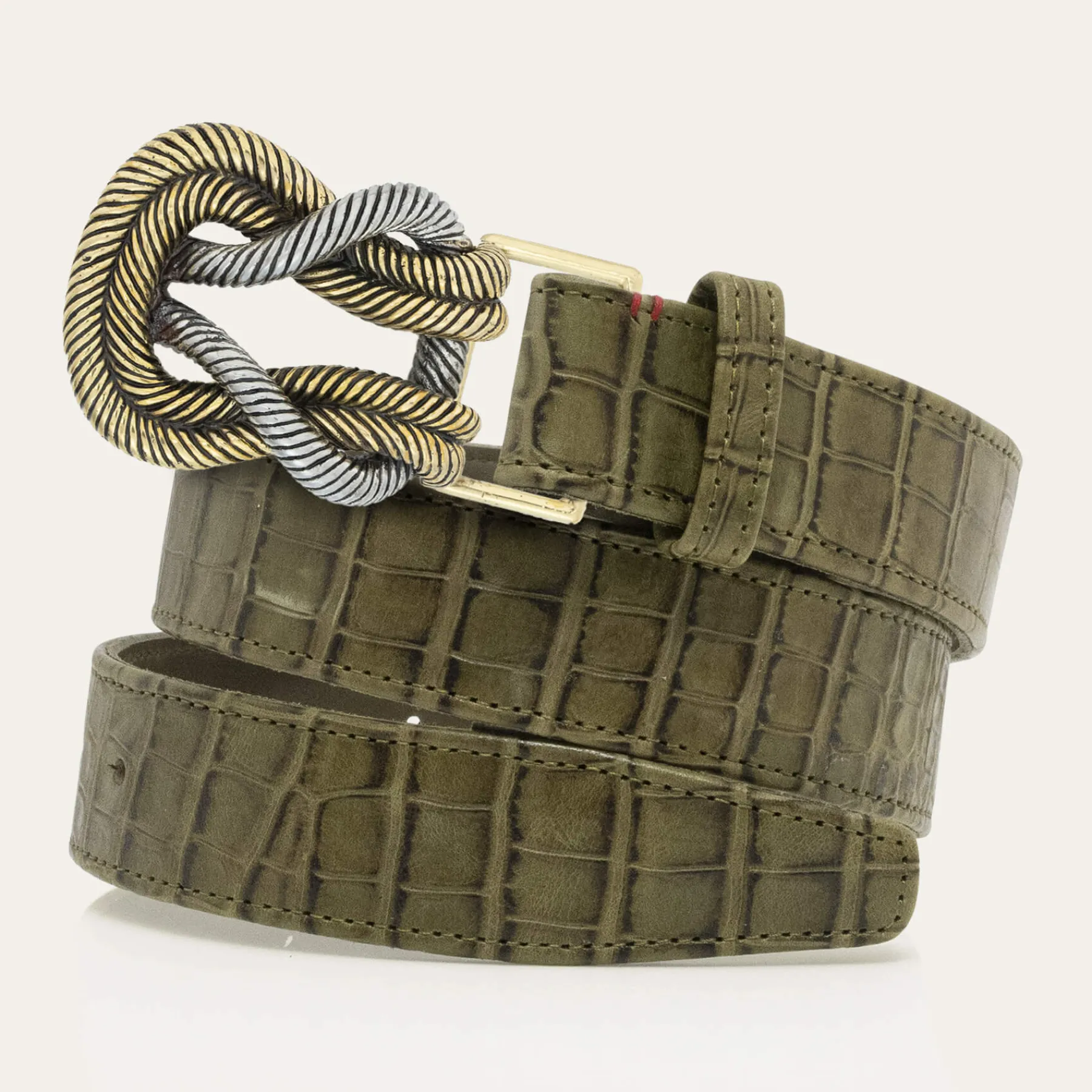 Ce ceinturon doublé de cuir, est orné d’une magnifique boucle ovale en forme de noeud et en laiton. Elle donne un look fort aux tenues les plus simples et se porte aussi bien sur un jean que sur une robe.