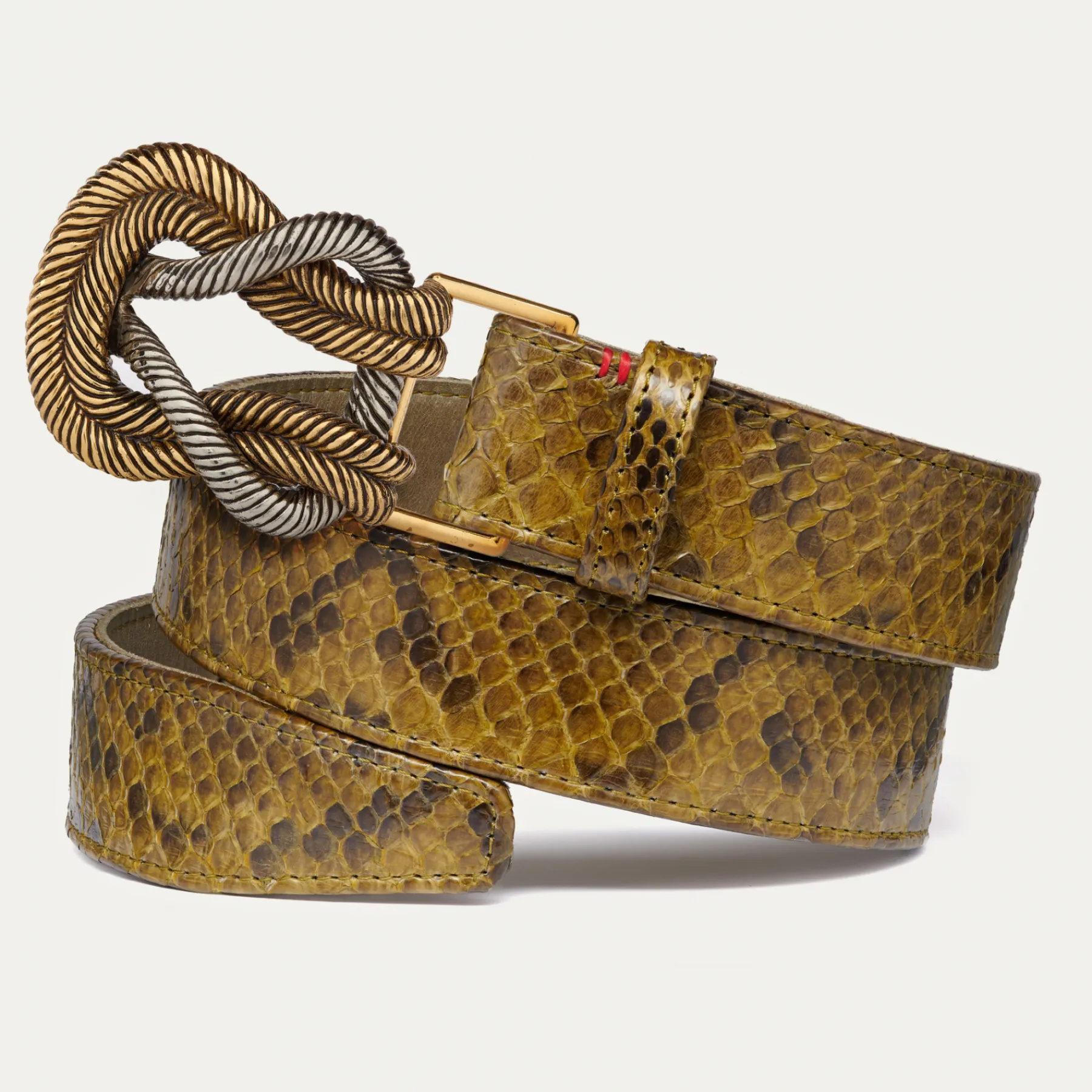 Ce ceinturon en python, doublé de cuir, est orné d’une magnifique boucle ovale en forme de noeud et en laiton. Elle donne un look fort aux tenues les plus simples et se porte aussi bien sur un jean que sur une robe.