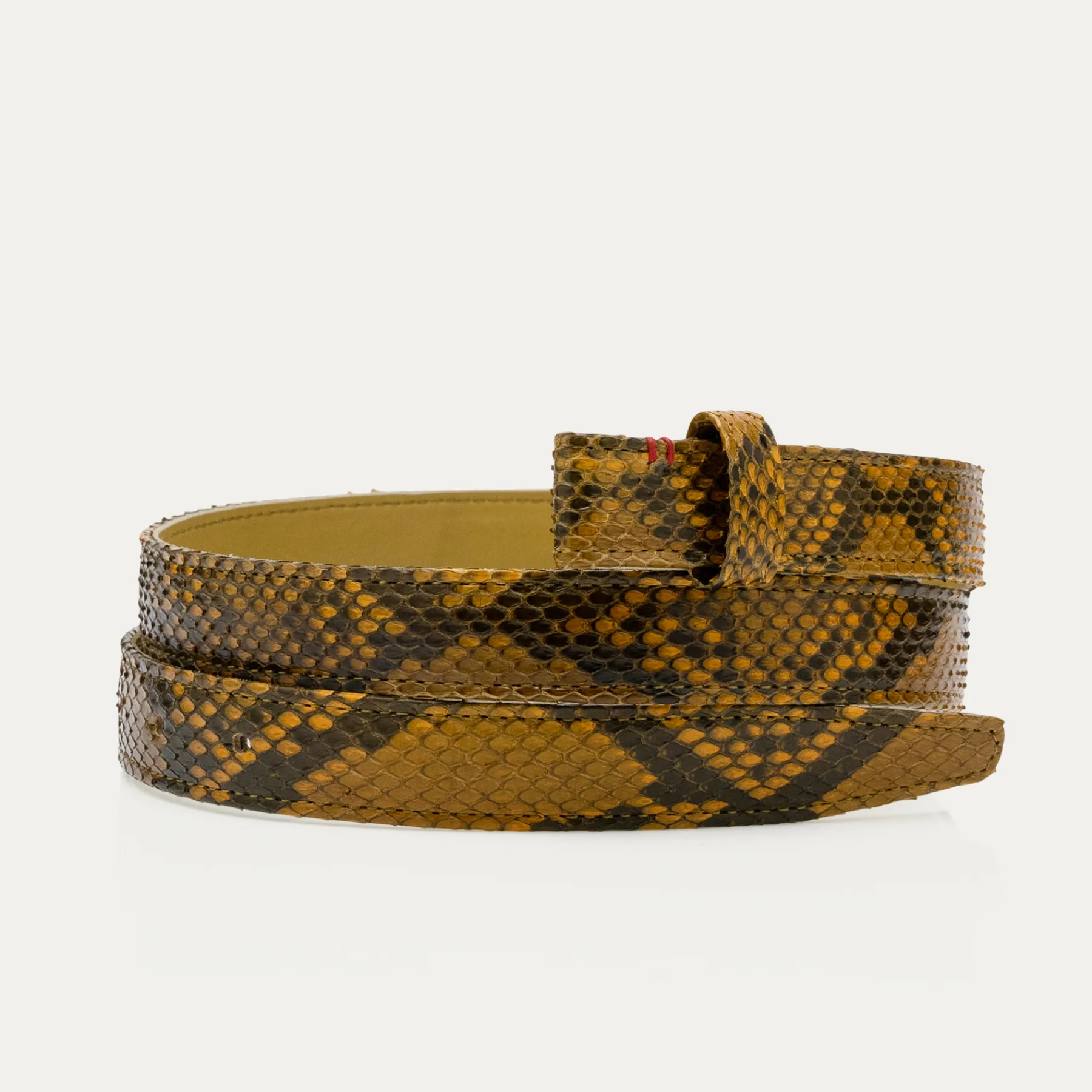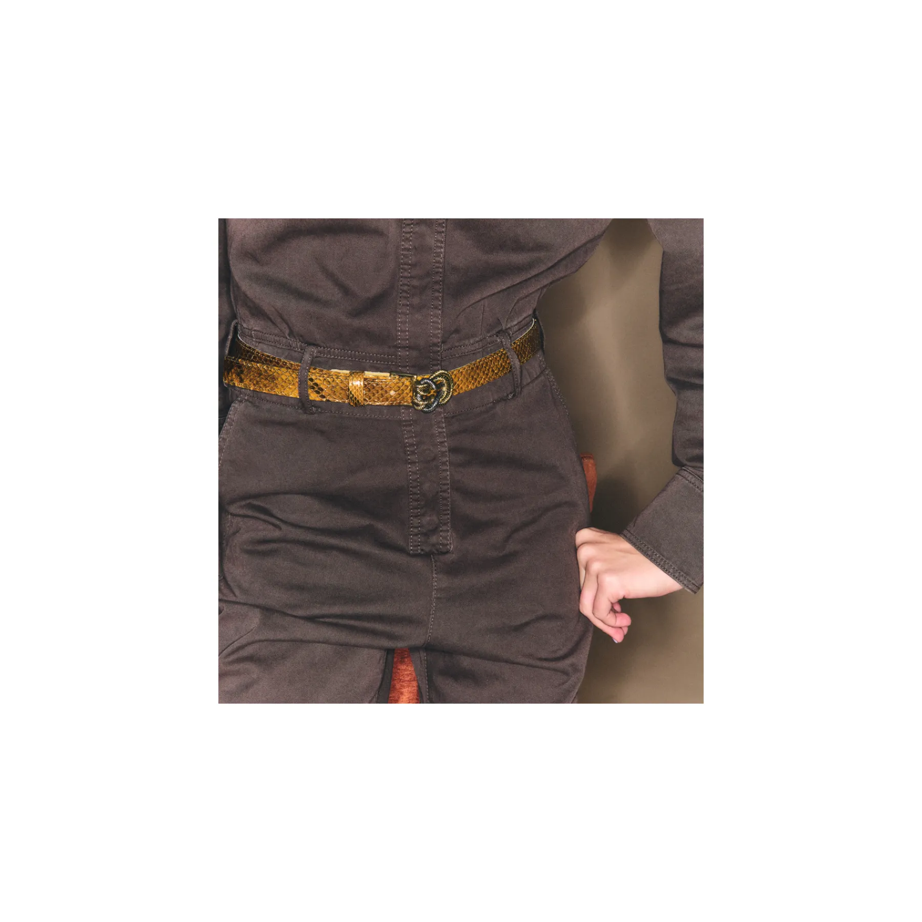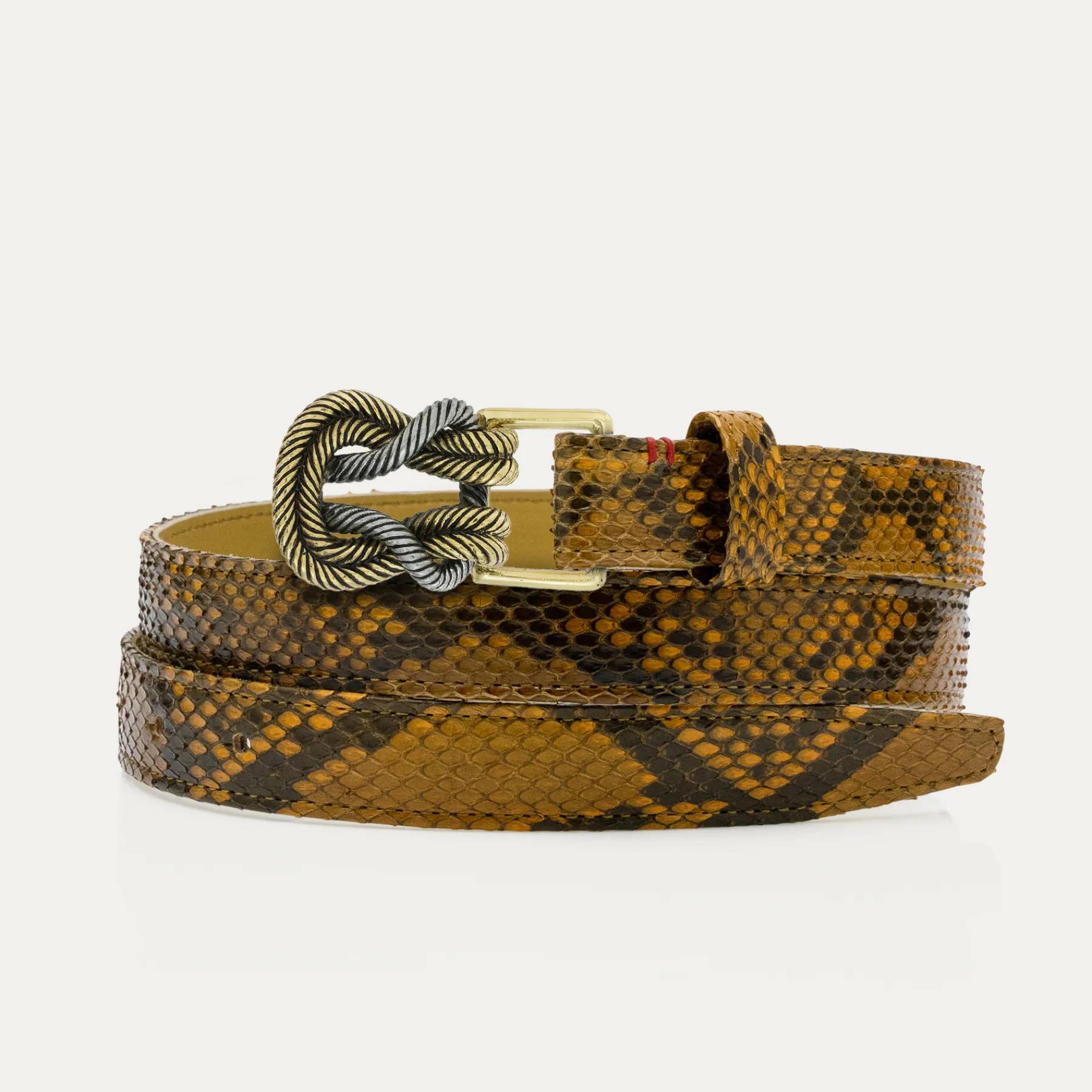 Ce ceinturon en python, doublé de cuir, est orné d’une magnifique boucle ovale en forme de noeud et en laiton. Elle donne un look fort aux tenues les plus simples et se porte aussi bien sur un jean que sur une robe.