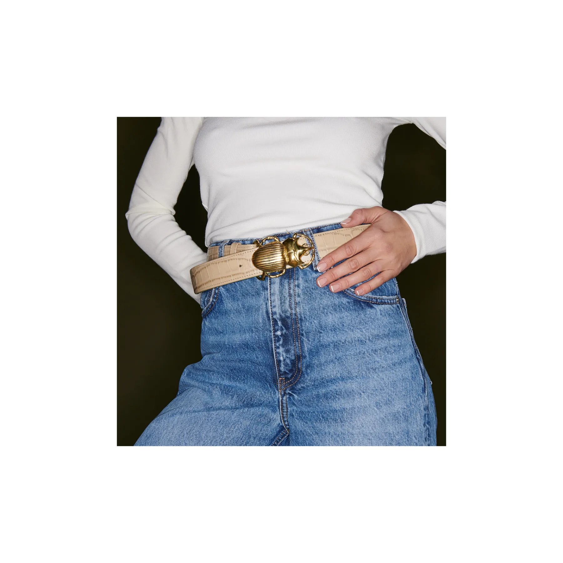 Ce ceinturon, doublé de cuir est orné d’une magnifique boucle en forme de scarabée. Elle donne un look fort aux tenue…