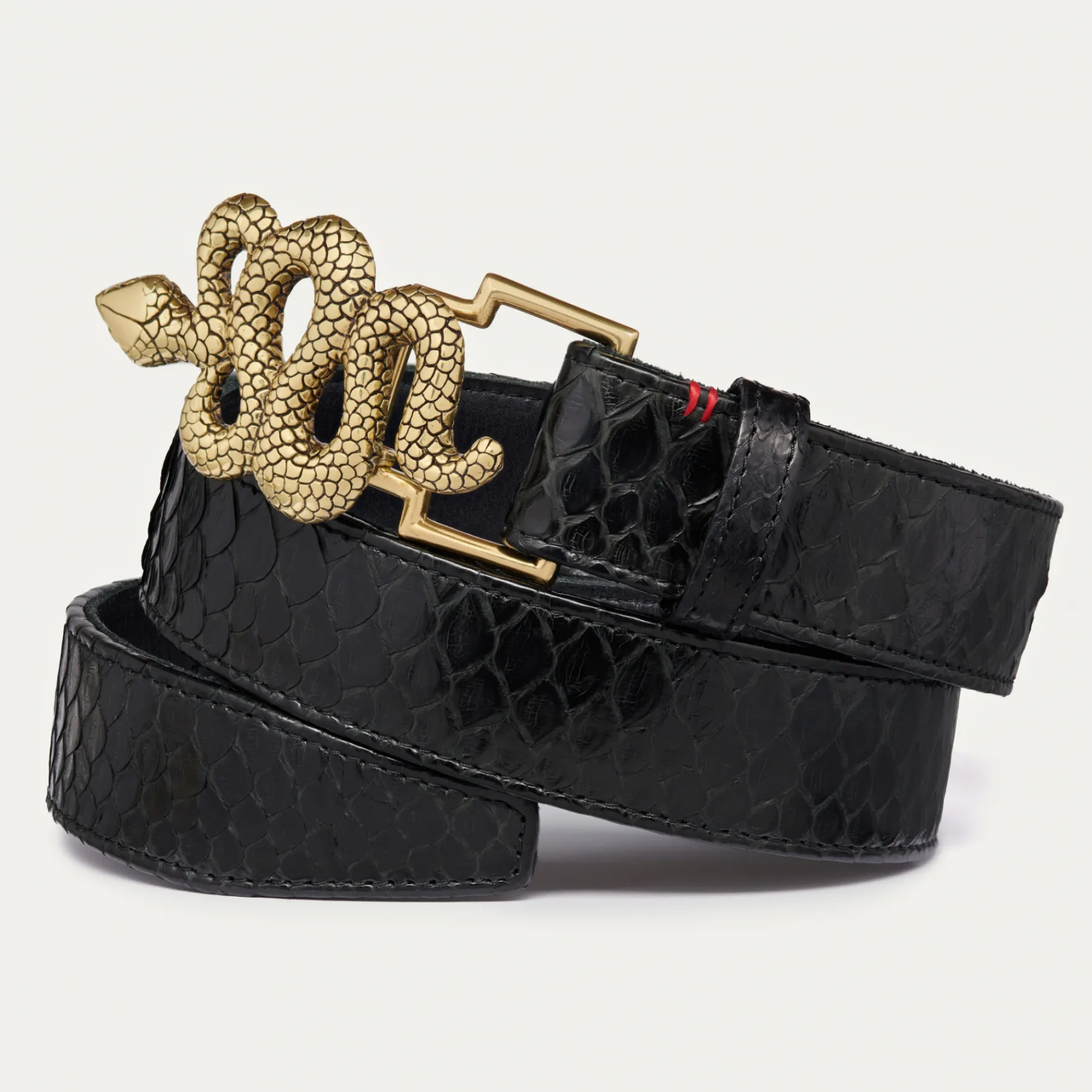 Ce ceinturon en python doublé de cuir est orné d’une magnifique boucle en forme de serpent. Elle donne un look fort au…