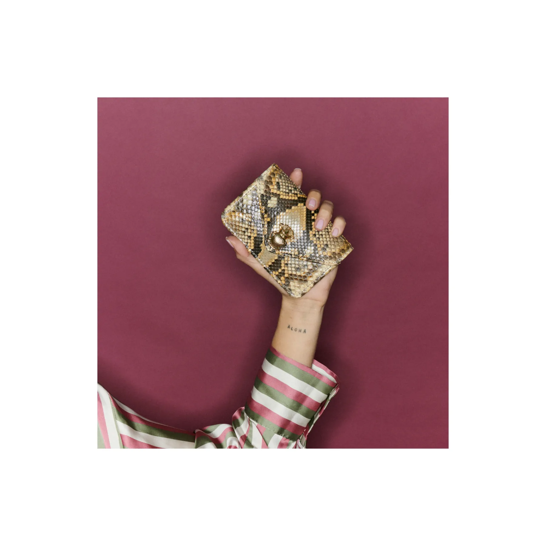 Cette petite pochette en python qui prend la forme d’une enveloppe est ornée d’un fermoir en forme de scarabée en laiton. Parfaite pour garder tous vos petits papiers et votre monnaie grâce à ses différents compartiments, elle se glissera facilement dans tous vos sacs.