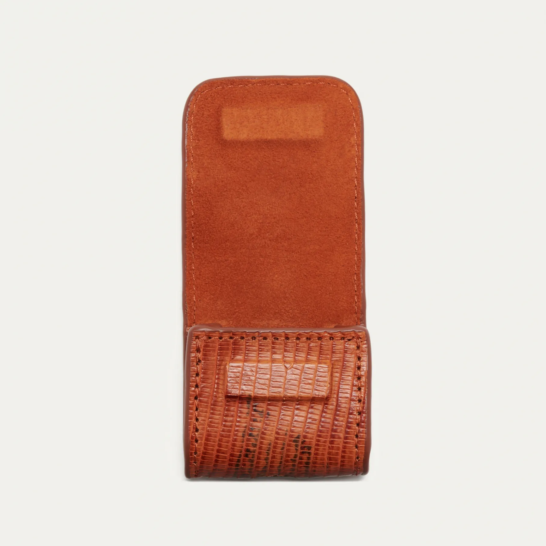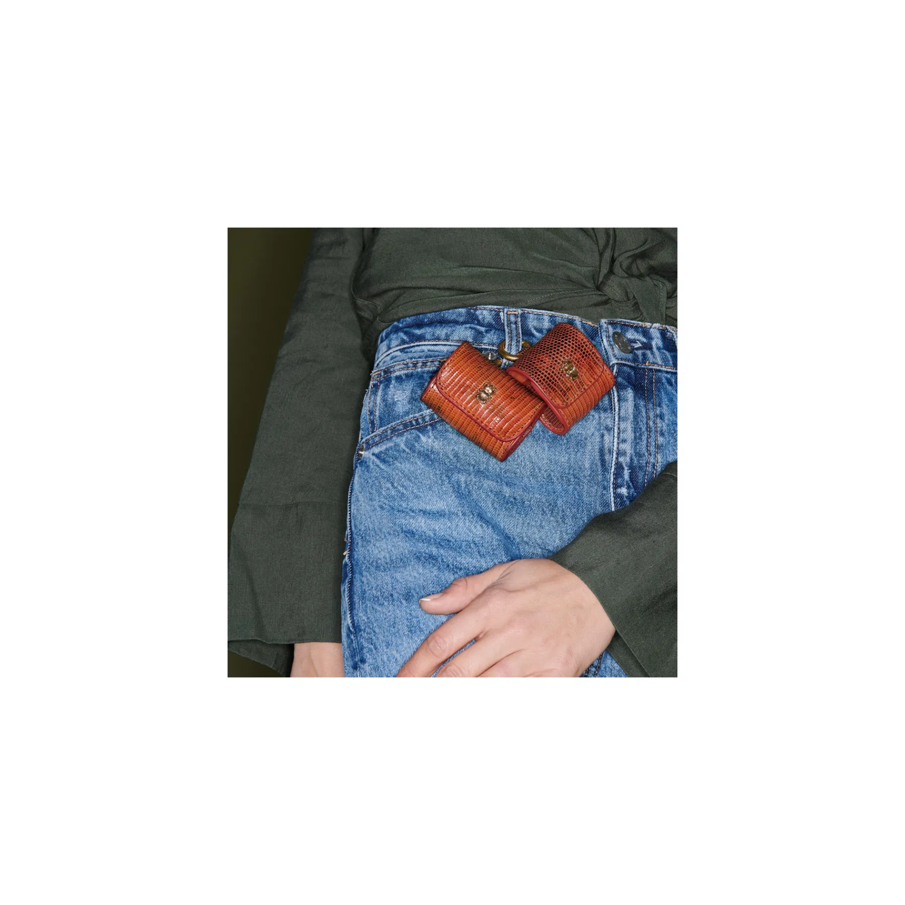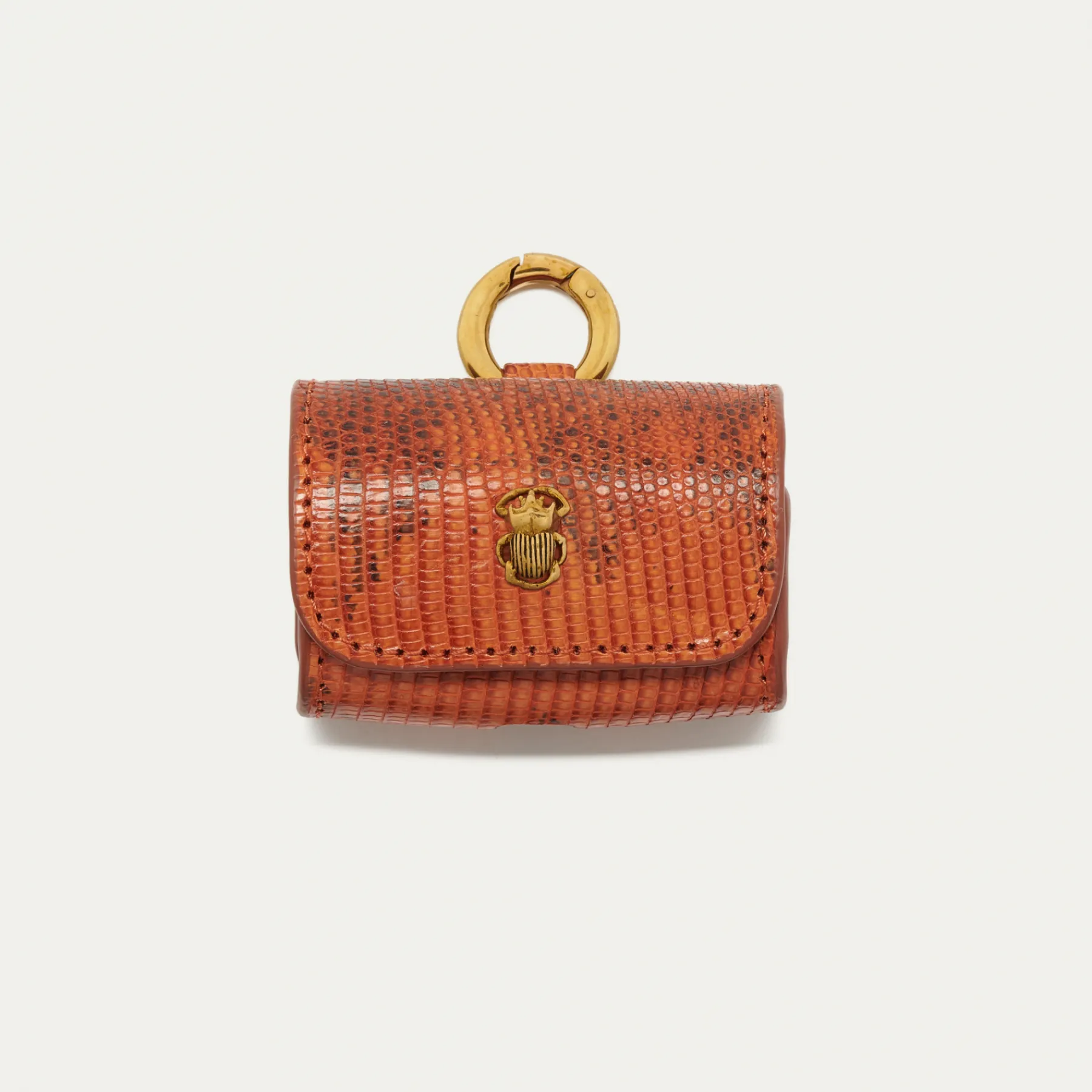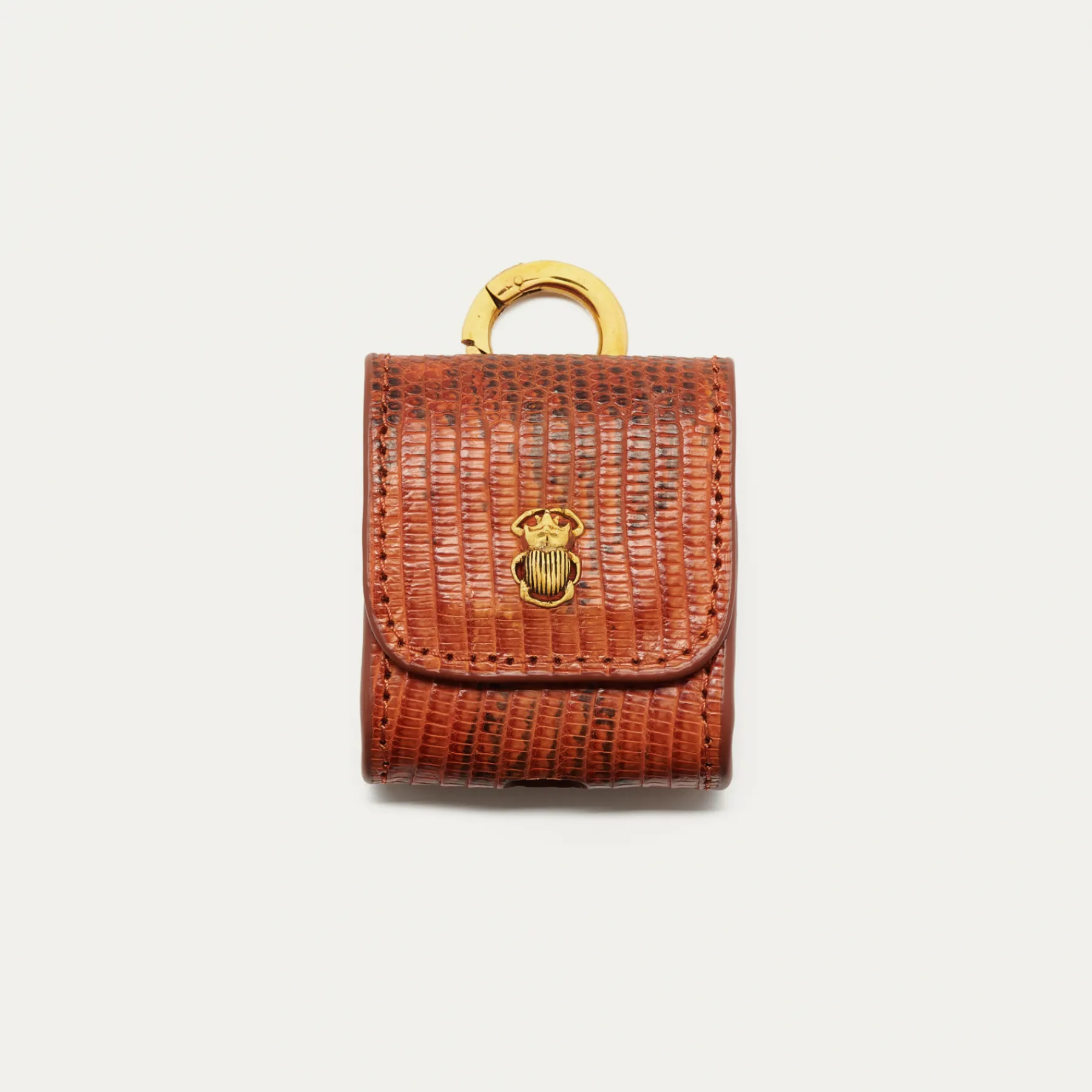 Notre premier étui à AirPods Jamie entièrement composé de lézard est orné d’une beetle dorée à l’avant. Son mousqueton vous permettra de l’accrocher aussi bien à vos passants de pantalon, qu’à votre sac ou étui de téléphone portable, tel que notre Double Marcus.