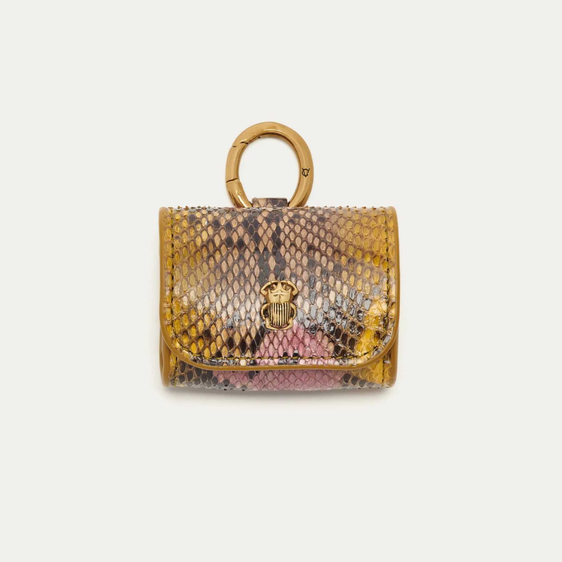 Notre premier étui à AirPods Jamie entièrement composé de python est orné d’une beetle dorée à l’avant. Son mousqueton vous permettra de l’accrocher aussi bien à vos passants de pantalon, qu’à votre sac ou étui de téléphone portable, tel que notre Double Marcus.