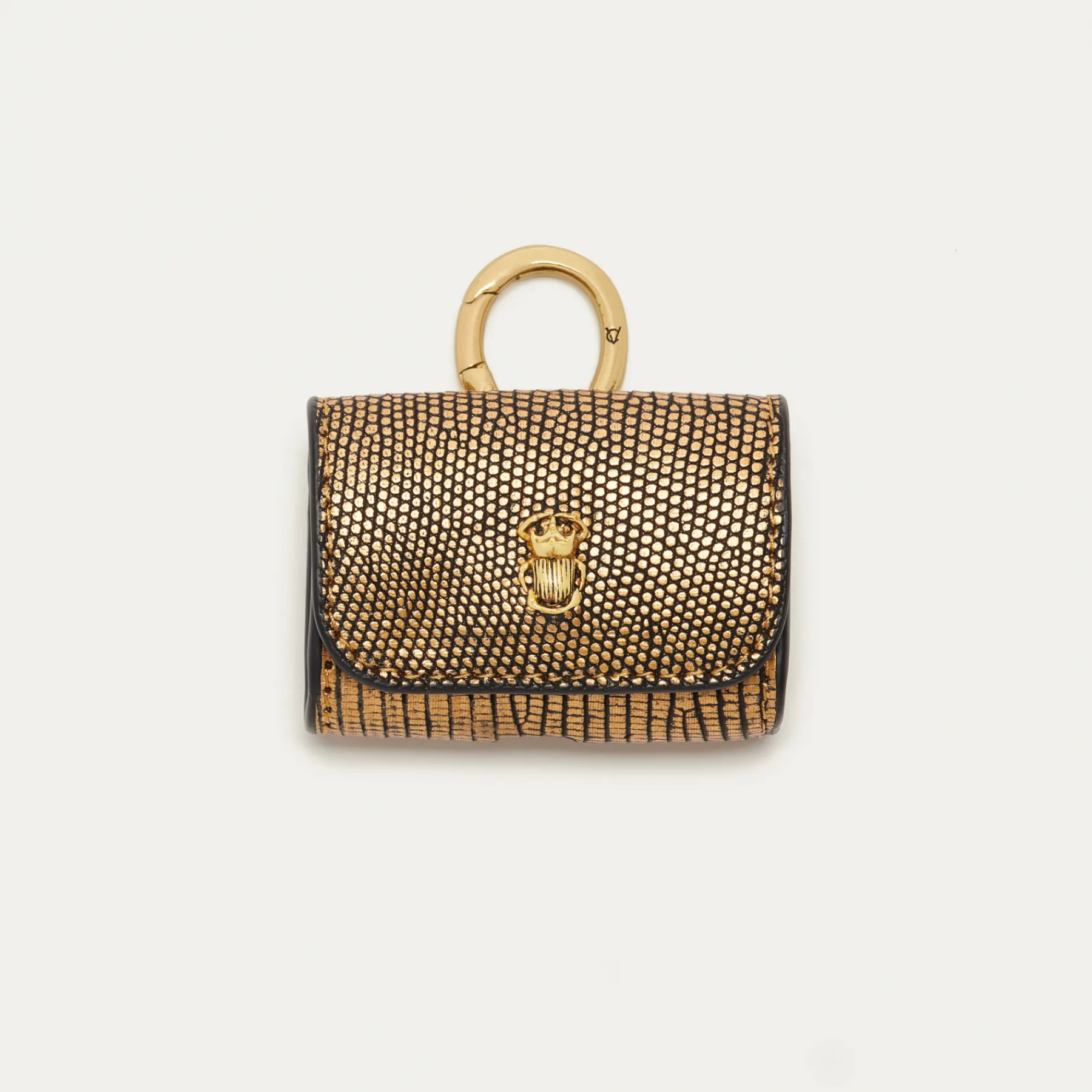 Notre premier étui à AirPods Jamie entièrement composé de lézard est orné d’une beetle dorée à l’avant. Son mousqueton vous permettra de l’accrocher aussi bien à vos passants de pantalon, qu’à votre sac ou étui de téléphone portable, tel que notre Double Marcus.