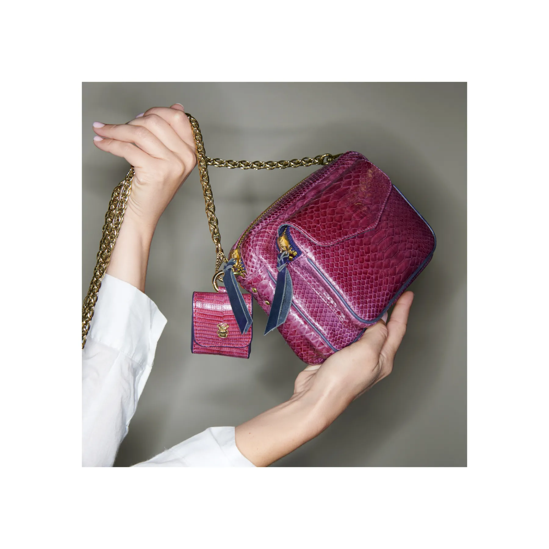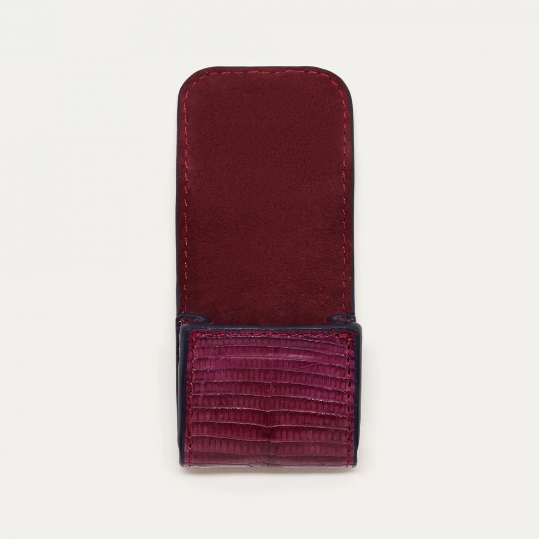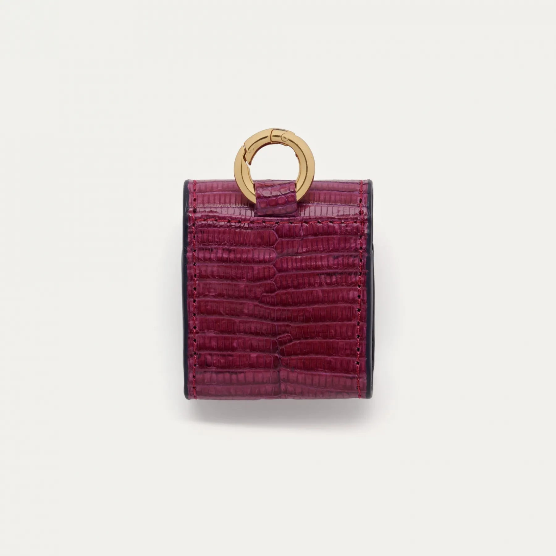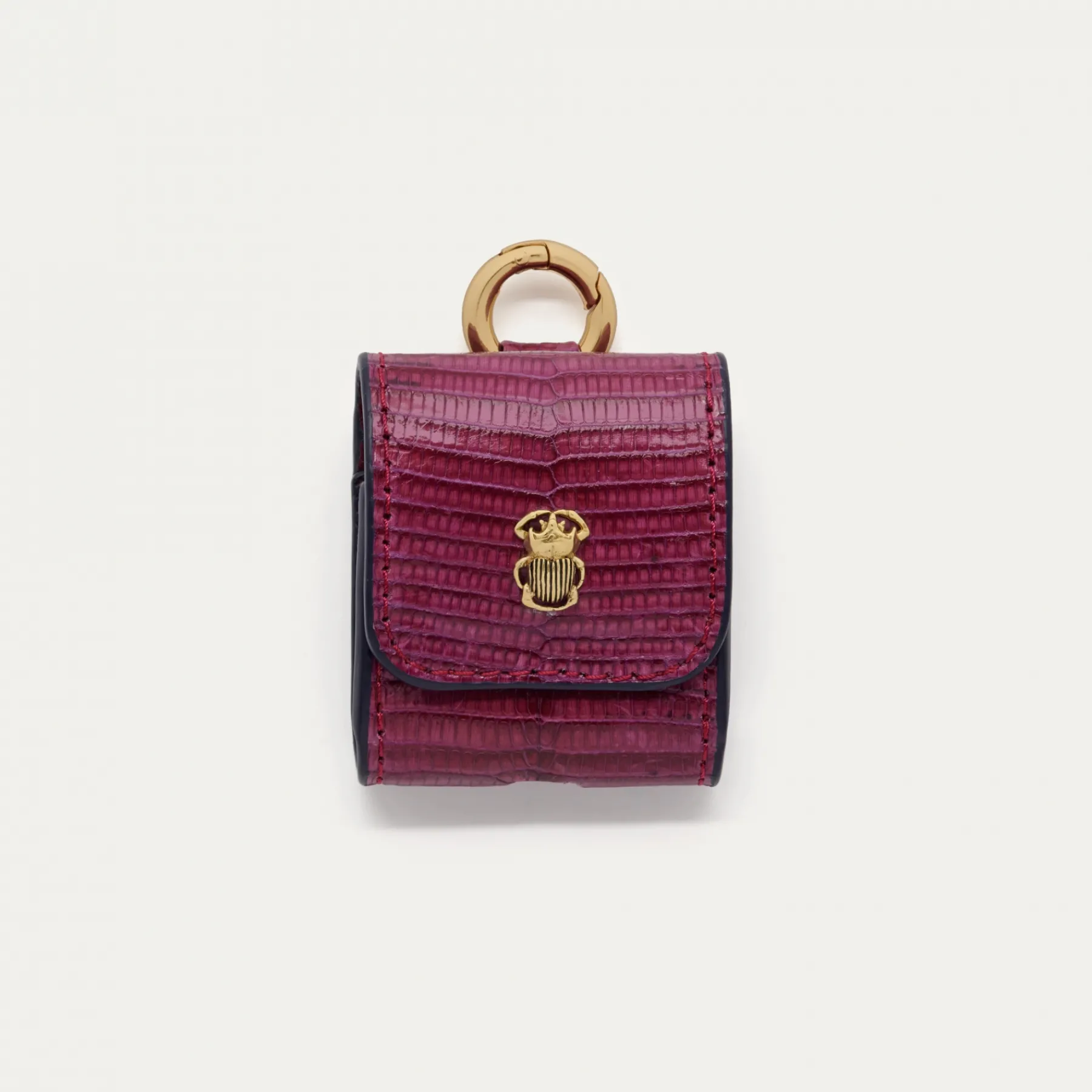 Notre premier étui à AirPods Jamie entièrement composé de lézard est orné d’une beetle dorée à l’avant. Son mousqueton vous permettra de l’accrocher aussi bien à vos passants de pantalon, qu’à votre sac ou étui de téléphone portable, tel que notre Double Marcus.