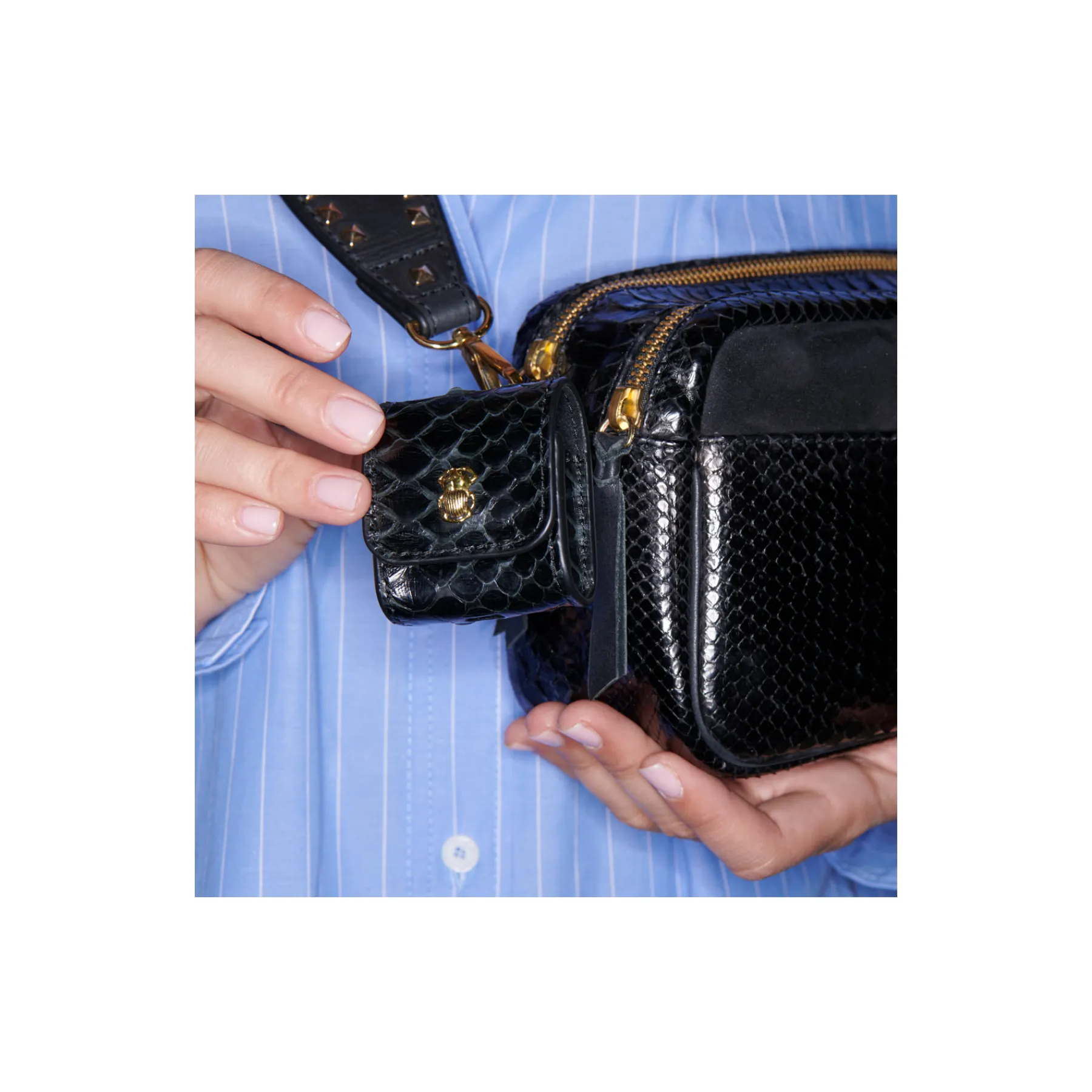 Notre premier étui à AirPods Jamie entièrement composé de python est orné d’une beetle dorée à l’avant. Son mousqueton vous permettra de l’accrocher aussi bien à vos passants de pantalon, qu’à votre sac ou étui de téléphone portable, tel que notre Double Marcus.