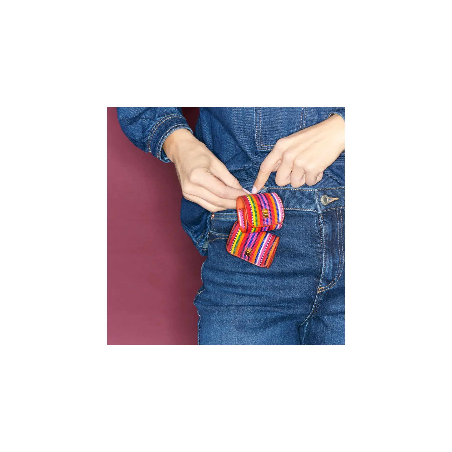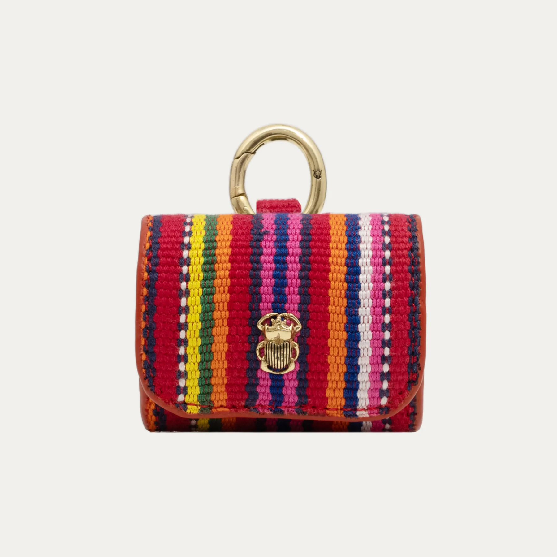 Notre premier étui à AirPods Jamie entièrement composé de tissu poncho est orné d’une beetle dorée à l’avant. Son mousqueton vous permettra de l’accrocher aussi bien à vos passants de pantalon, qu’à votre sac ou étui de téléphone portable, tel que notre Double Marcus.