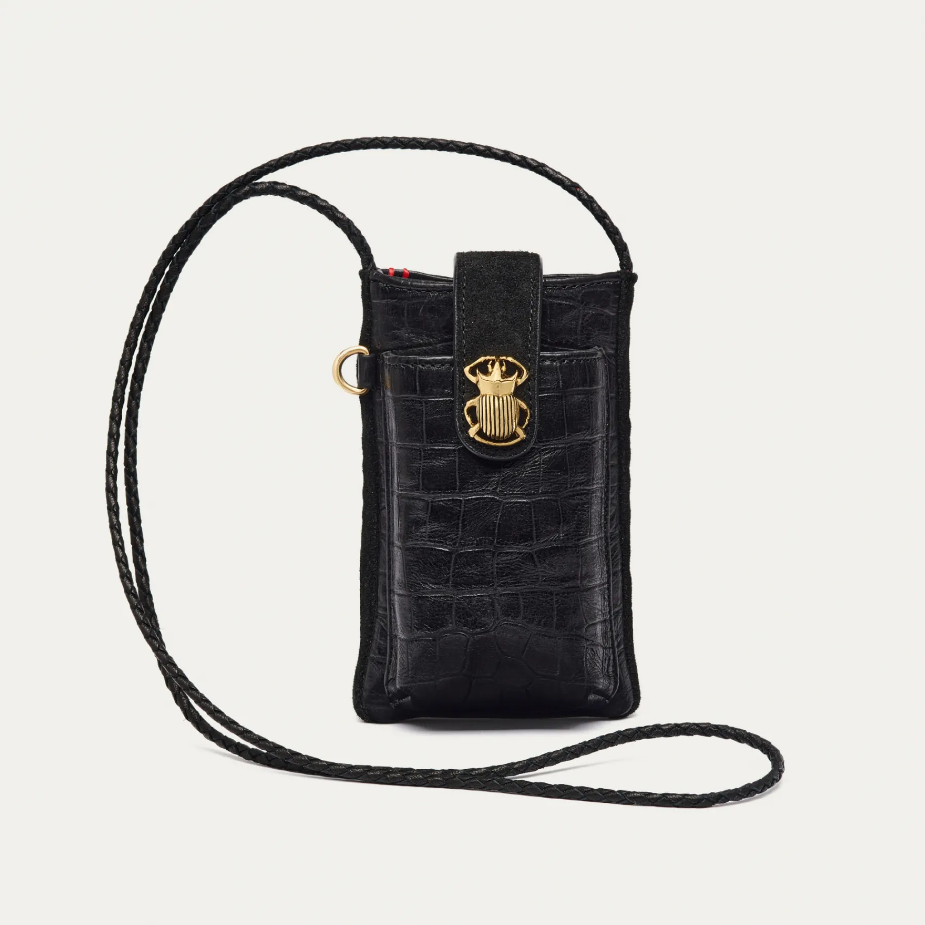 Cette pochette en cuir embossé croco conçue afin de transporter votre téléphone est réalisée à la main. Le double Marcus est doté de deux compartiments. La poche principale vous permettra d’accueillir votre smartphone et la poche avant vos lunettes. Ces deux poches se ferment à l’aide d’un rabat aimanté, orné d’un scarabée doré. À l’arrière, 3 fentes vous permettront d’y ranger vos différentes cartes.
