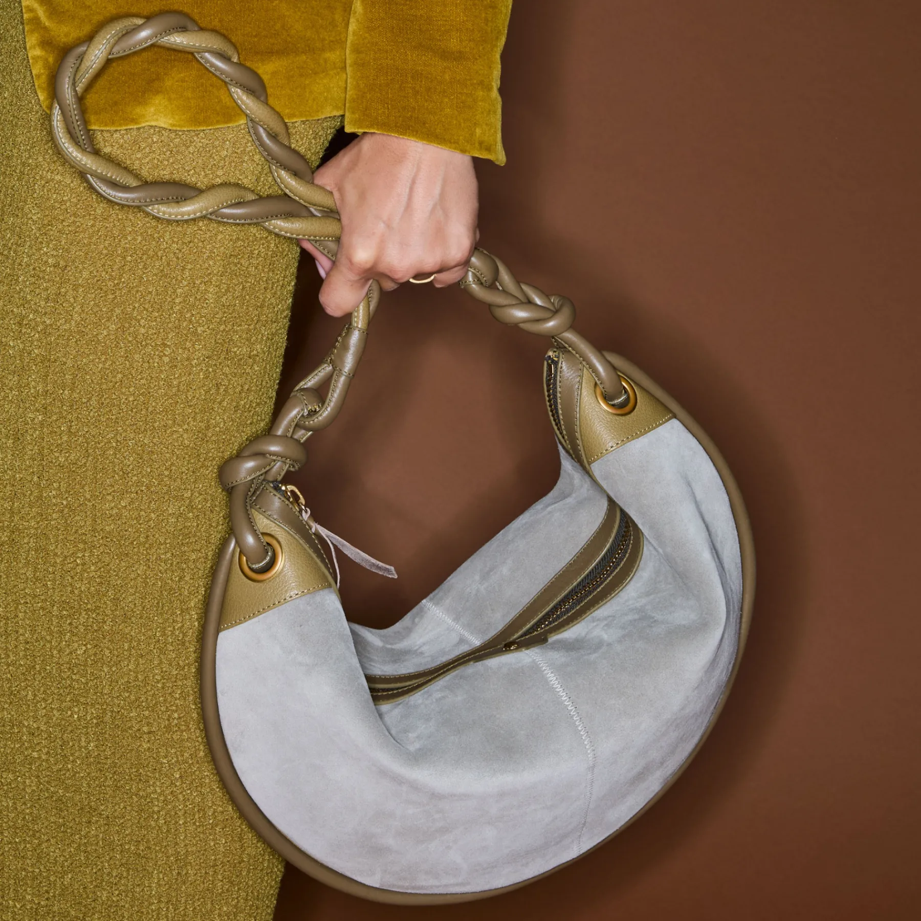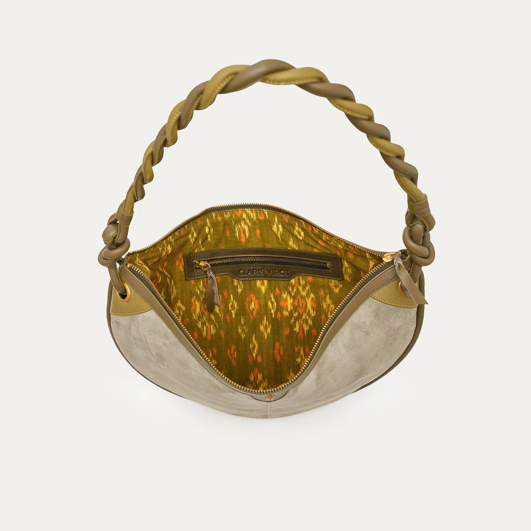 Notre nouveau sac demi-lune Chris est composé de cuir vintage. Son anse, entrelacée par de gros noeuds en cuir, p…