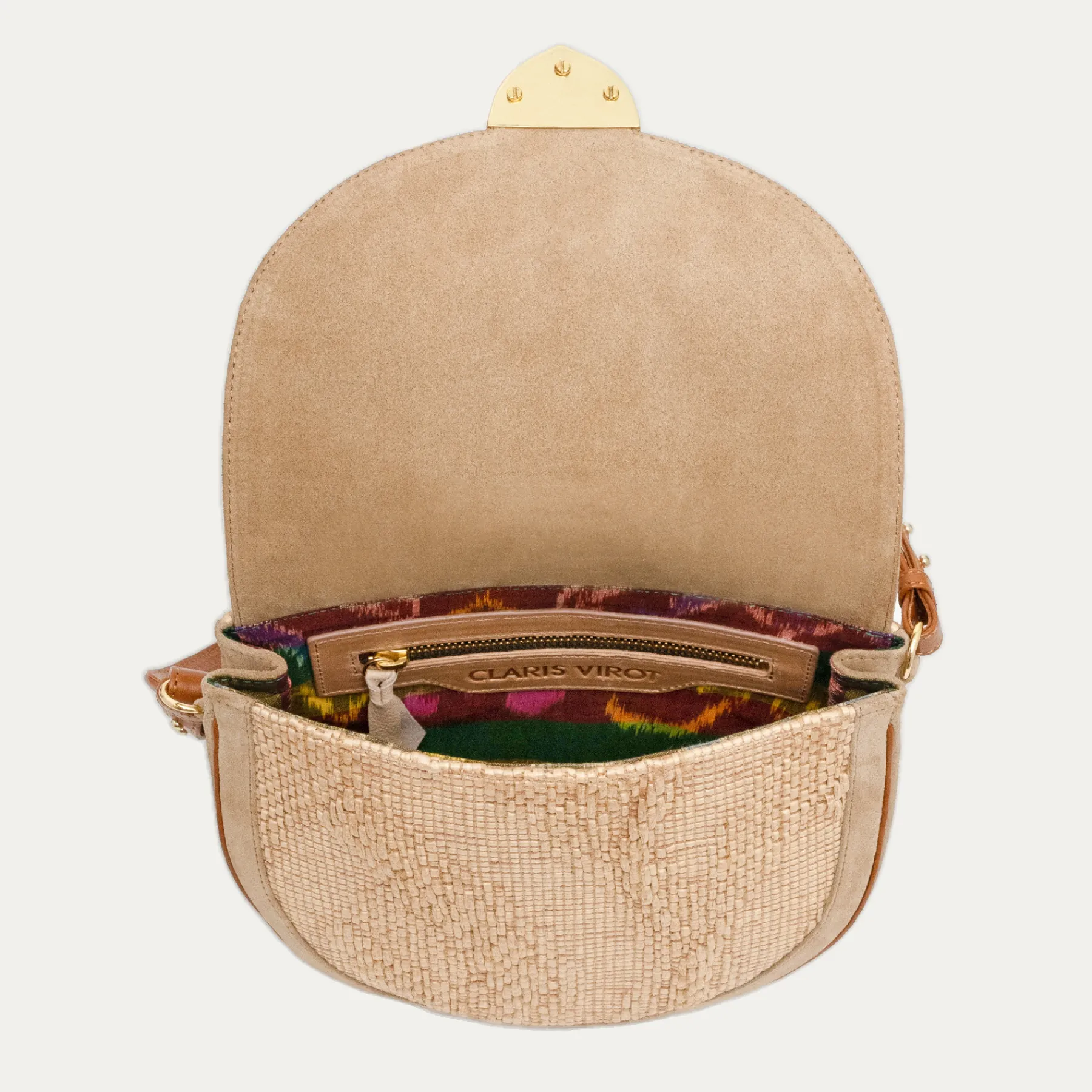 Notre nouveau sac besace bi-matière Big Victoria est composé de tissu raphia et de veau velours. Victoria se ferme à l’aide d’un fermoir à embout métallique finement martelé et orné d’un petit scarabée. Plus grand que le Victoria mais également organisé en un seul compartiment avec une poche interne zippée, le Big Victoria pourra transporter tous vos effets personnels.