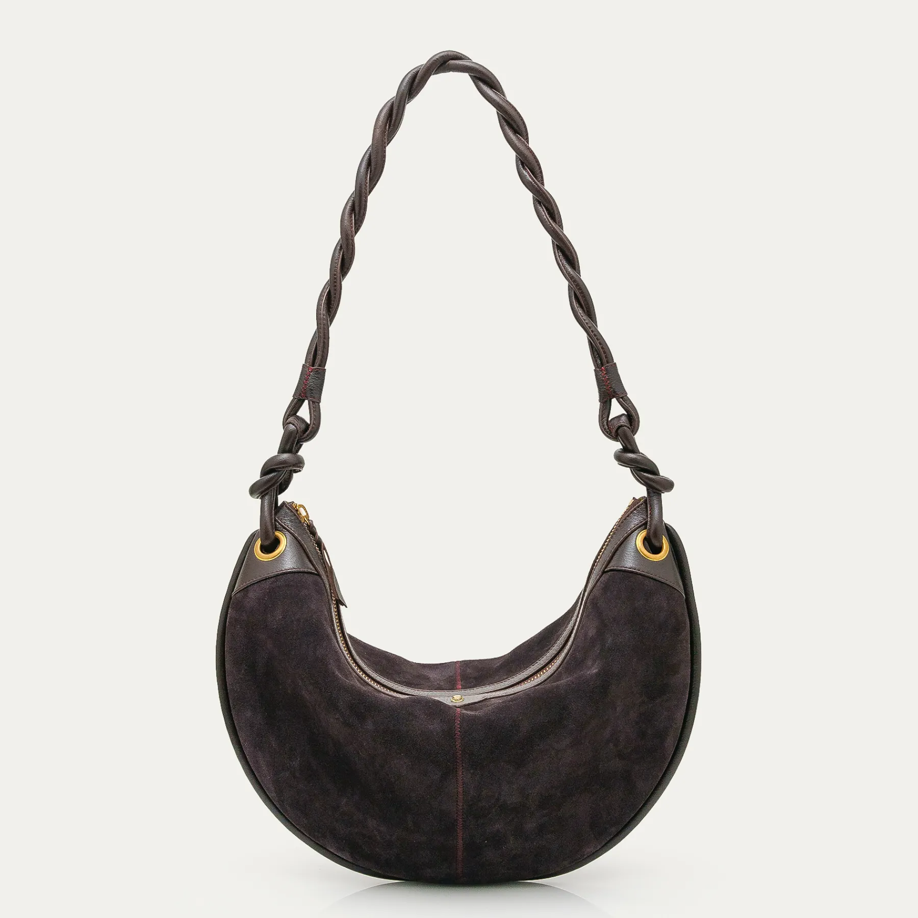 Notre nouveau sac demi-lune Chris est composé de cuir vintage. Son anse, entrelacée par de gros noeuds en cuir, p…