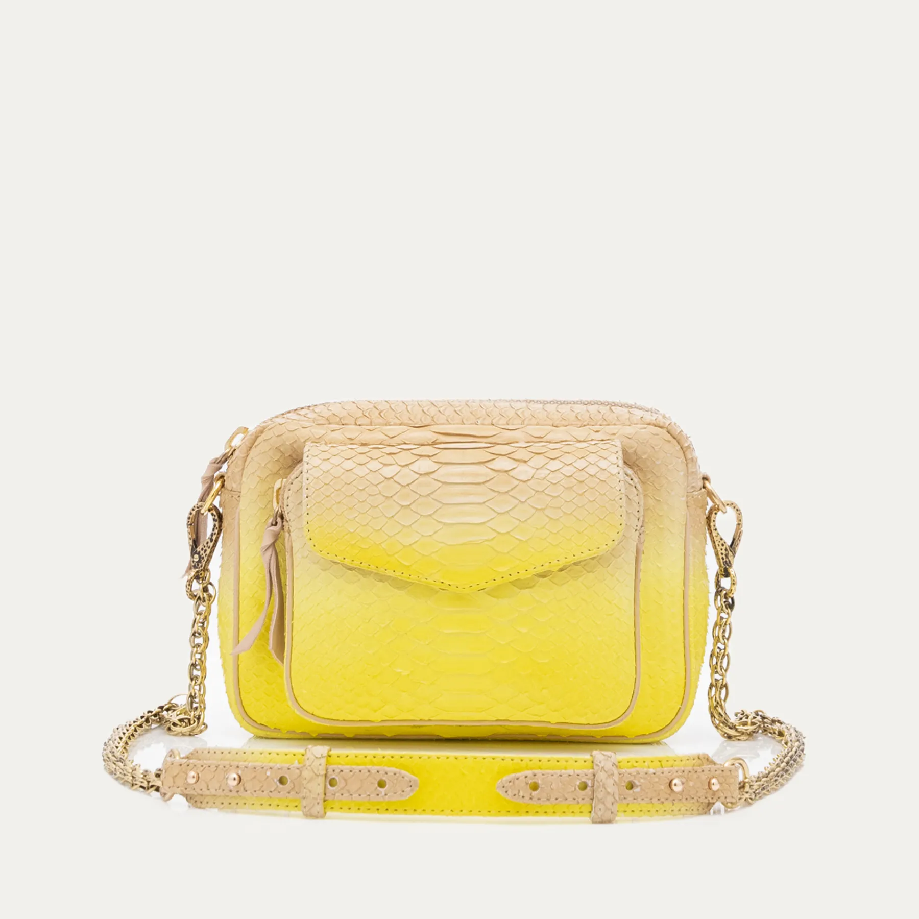 Ce sac porté croisé ou épaule est organisé en un compartiment avec une poche à l’avant. Notre Charly en python est muni d’une chaîne artisanale et de nombreux espaces de rangement qui vous faciliteront la vie. Grâce à sa couleur unique, sa forme intemporelle, et sa matière souple, notre Charly trouvera immédiatement sa place dans votre dressing !