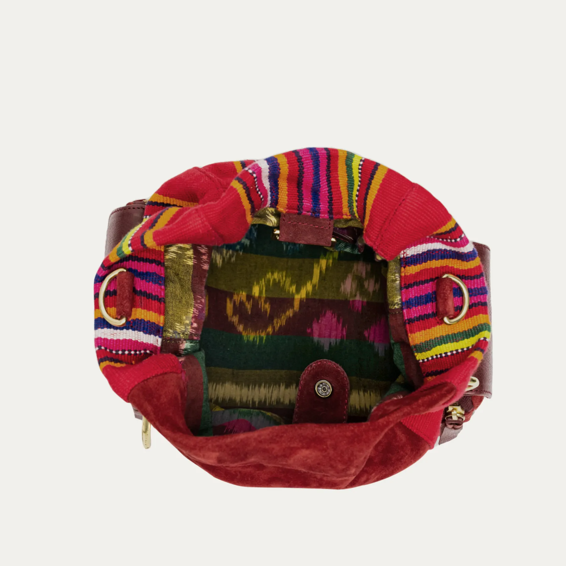 Le sac seau Lola est le sac qui vous accompagnera partout. Composé de veau velours, de cuir et de tissus poncho tissé à la main, il peut se porter en sac à dos ou à l’épaule, grâce à son ingénieuse bandoulière. Son compartiment principal se referme grâce à une double fermeture: un mousqueton doré et un bouton pression. Ses deux poches latérales sont parfaites pour accueillir clefs et cartes.