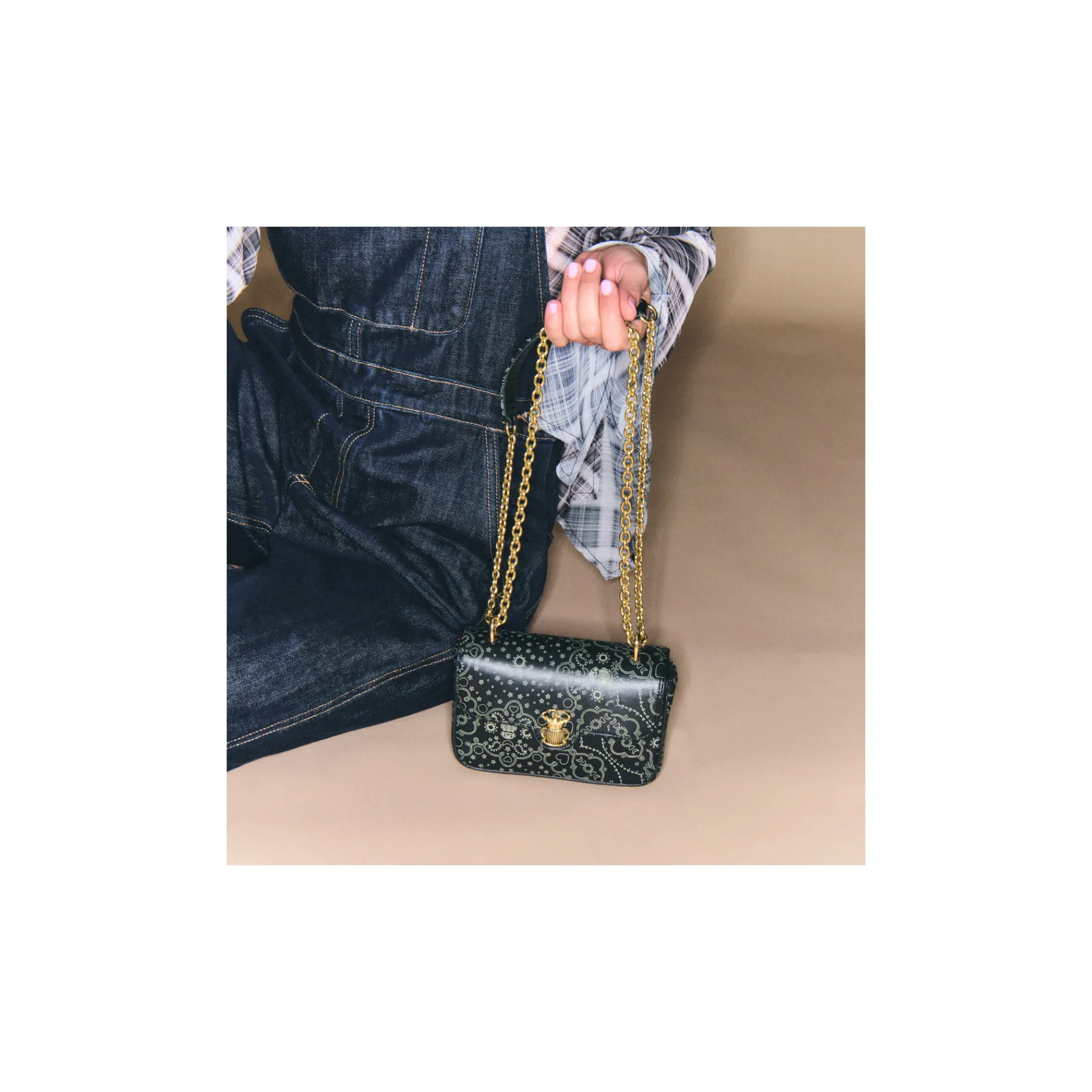 Notre mini sac Ava est idéal pour accompagner vos sorties. Ce sac en cuir imprimé porté épaule ou croisé est doté d’un fermoir bijou ainsi que d’une chaîne artisanale qui peut se porter simple ou double. Ava est organisé en un seul compartiment et s’adaptera en fonction de vos envies et saura discrètement habiller votre tenue pour toutes les occasions.