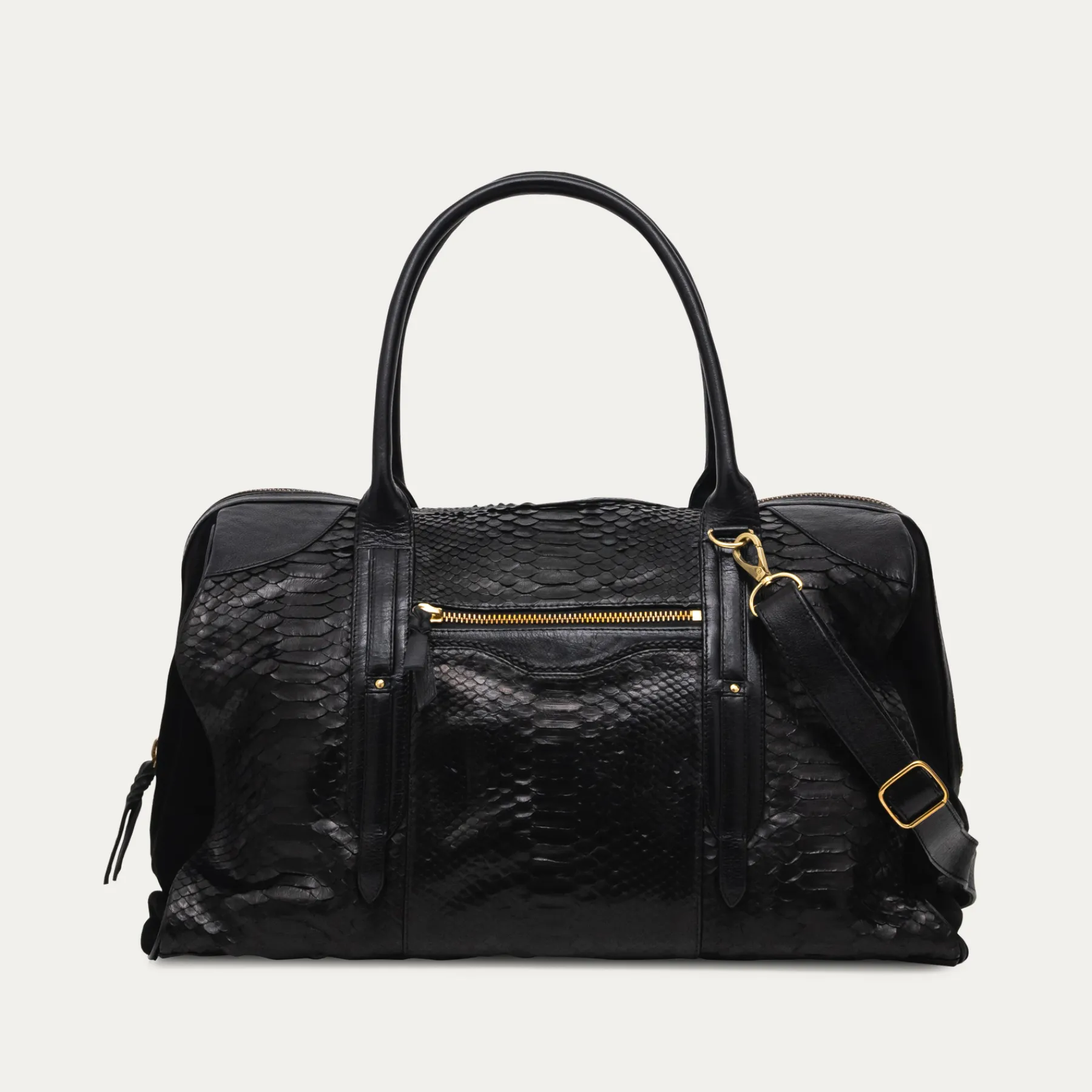 Ce nouveau sac bowling de voyage est unisexe. Composé de python et veau velours, notre sac June est doté de deux anses afin de le porter à l’épaule ou à la main. Pratique, son compartiment principal s’organise simplement et sa structure lui confère une meilleure ergonomie. De plus, sa poche extérieure zippée gardera tous vos essentiels. Très élégant et peu encombrant, il accompagnera tous vos weekends.