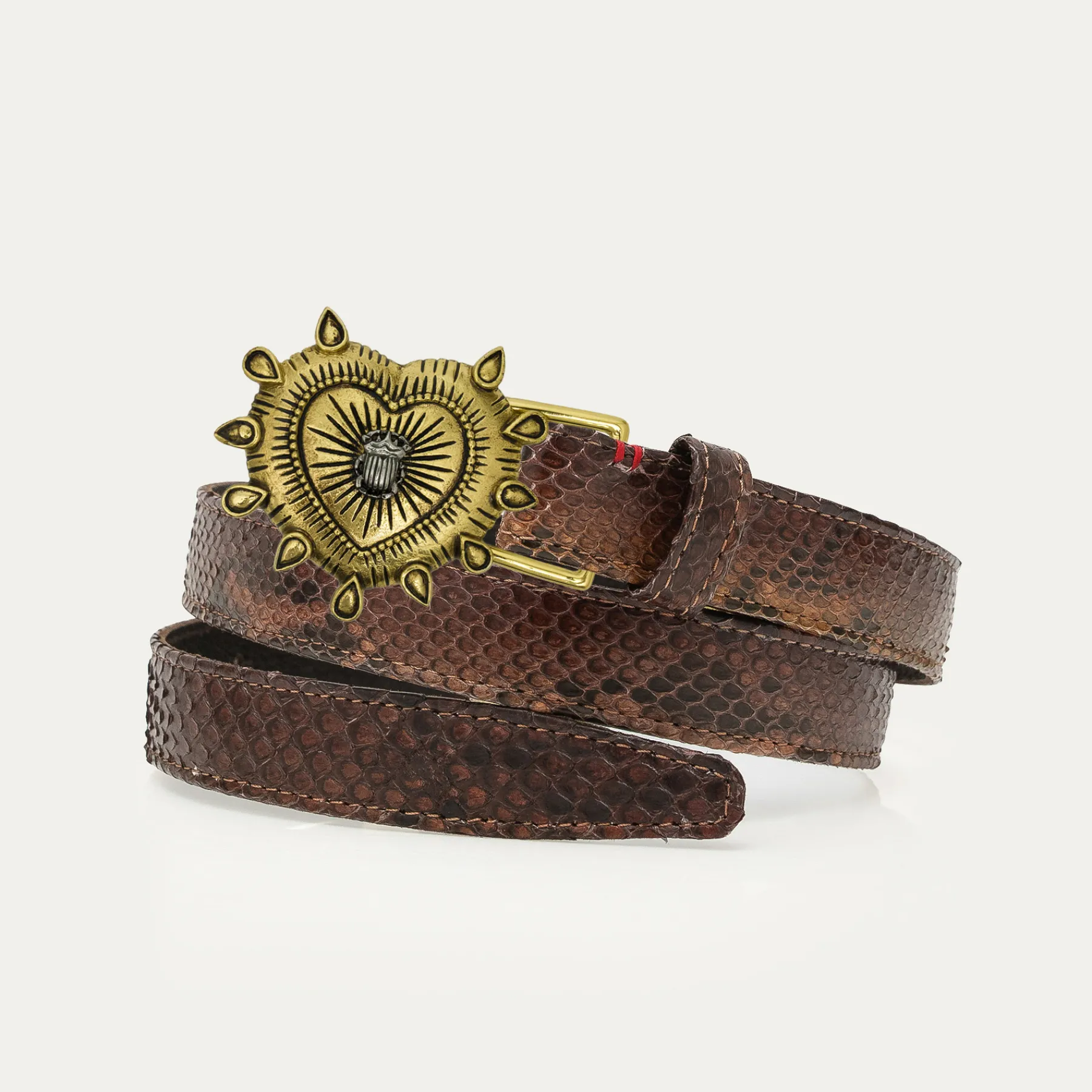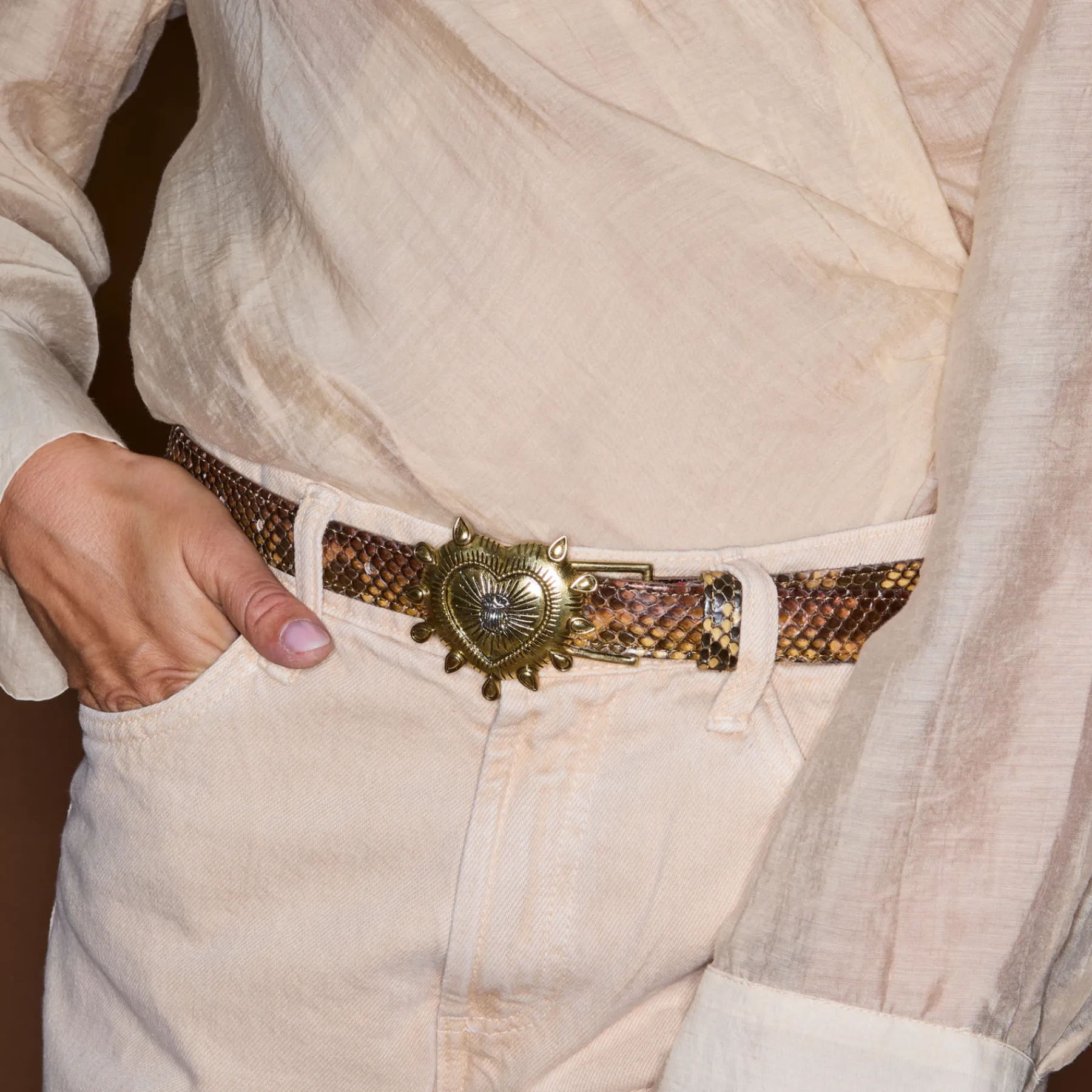 Ce ceinturon en python, doublé de cuir, est orné d’une magnifique boucle ex-voto. Elle donne un look fort aux tenues les plus simples et se porte aussi bien sur un jean que sur une robe.
