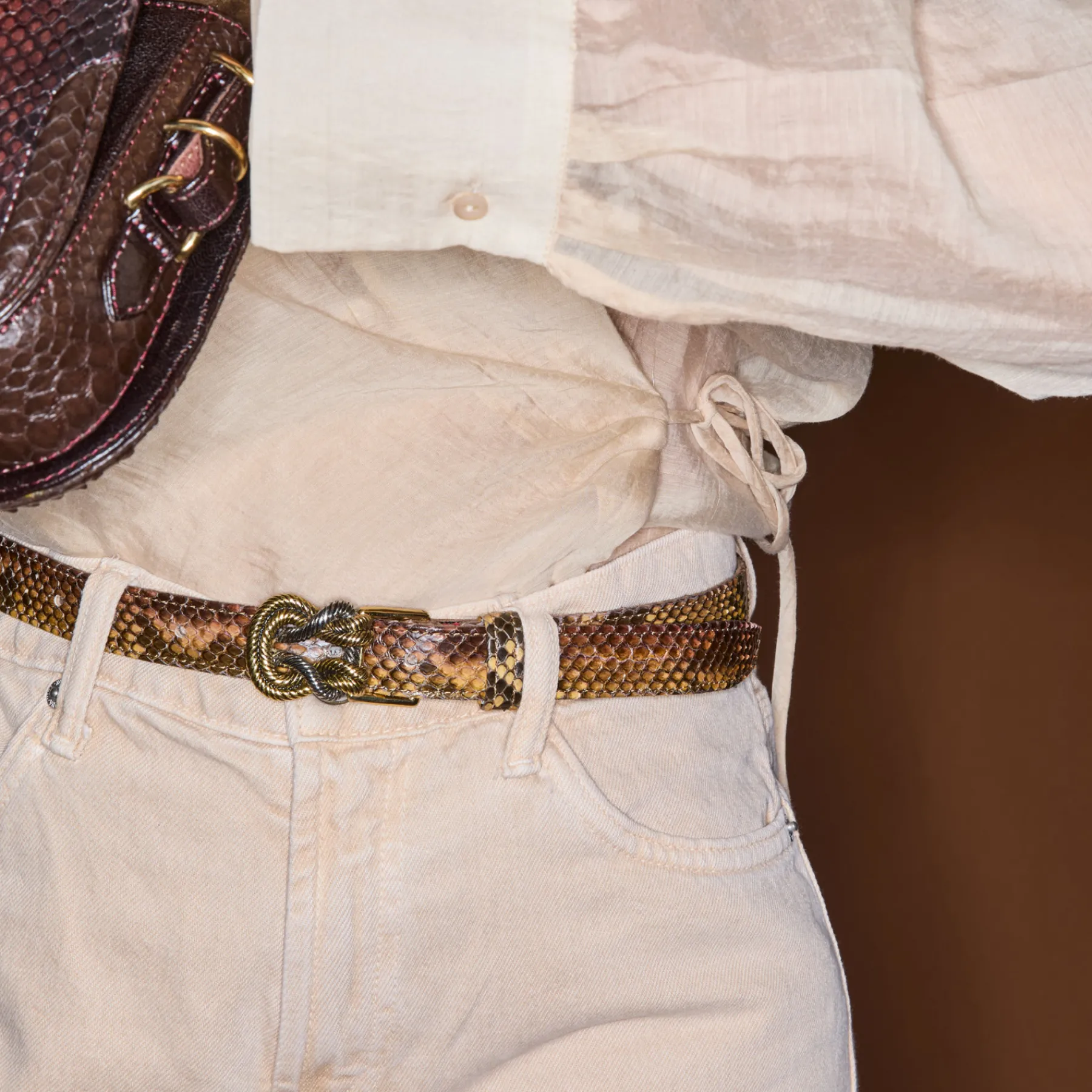 Ce ceinturon plus fin en python, doublé de cuir, est orné d’une magnifique boucle ovale en forme de noeud et en laiton. Elle donne un look fort aux tenues les plus simples et se porte aussi bien sur un jean que sur une robe.