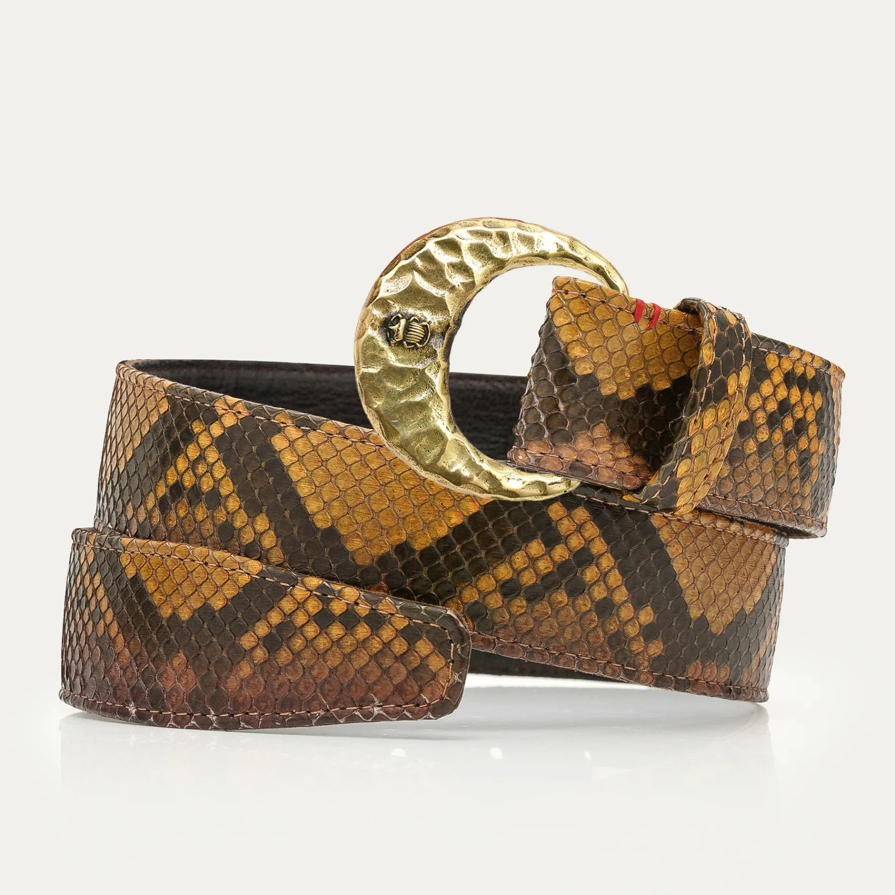 Ce ceinturon en python, doublé de cuir, est orné d’une magnifique boucle en laiton en forme de demi-lune. Elle donne un look fort aux tenues les plus simples et se porte aussi bien sur un jean que sur une robe.