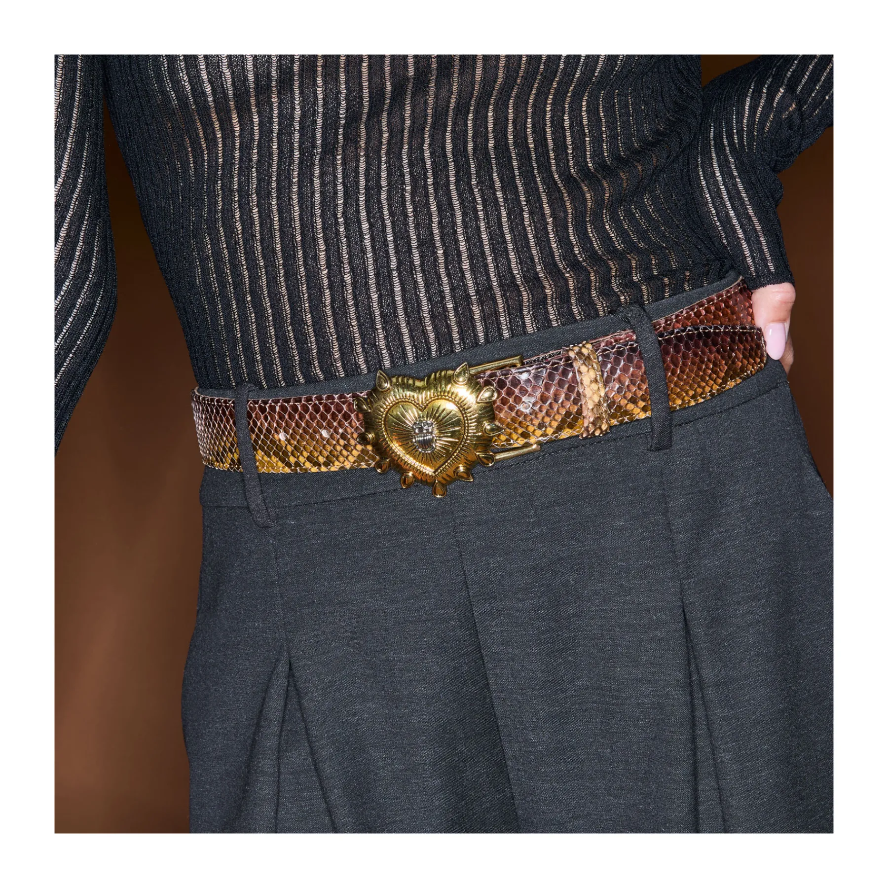 Ce ceinturon en python, doublé de cuir, est agrémenté d’une délicate boucle en laiton avec au centre un ex-voto. Il ajoute une touche distinctive et élégante aux tenues les plus simples, s’harmonisant aussi bien avec un jean qu’avec une robe.