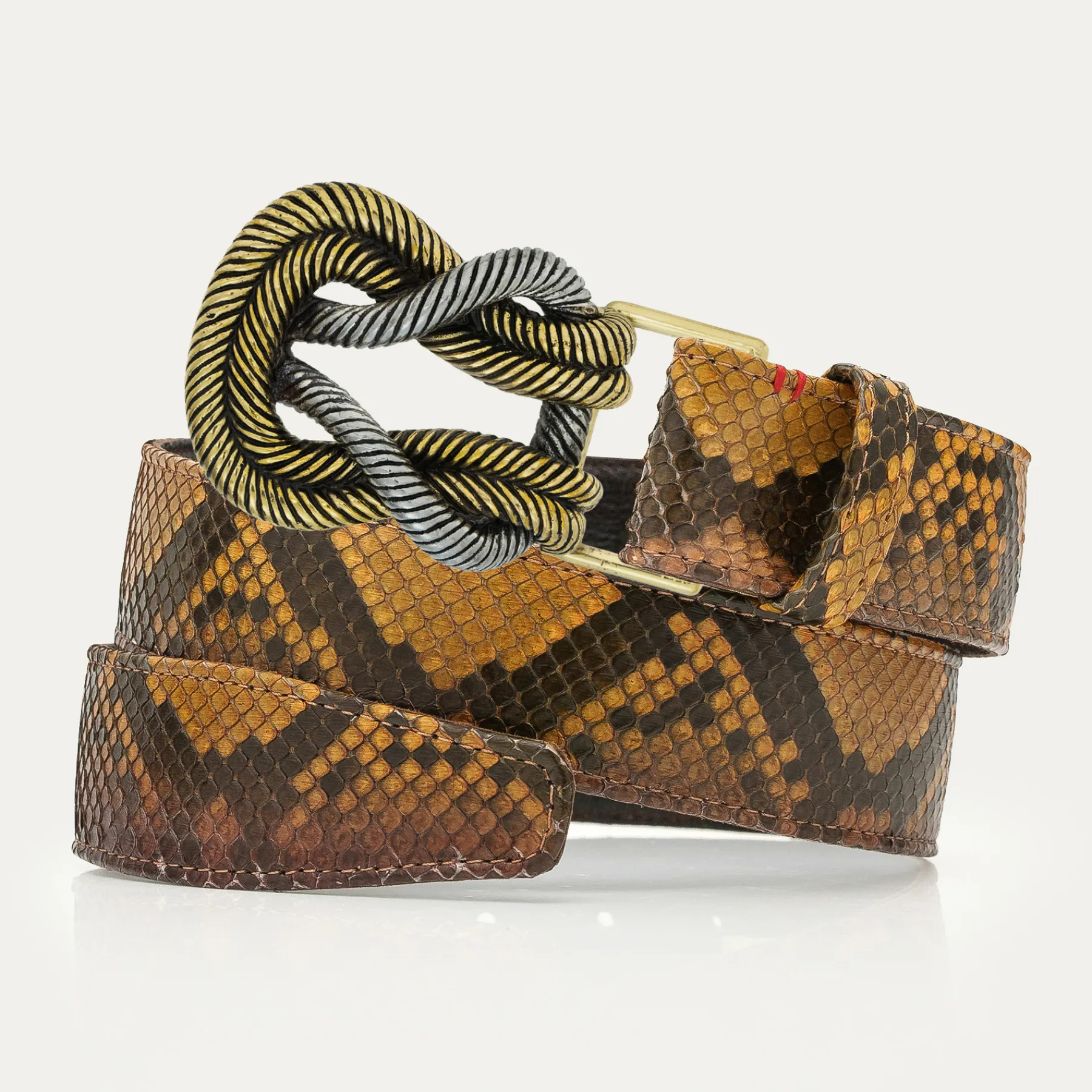 Ce ceinturon en python, doublé de cuir, est orné d’une magnifique boucle ovale en forme de noeud et en laiton. Elle donne un look fort aux tenues les plus simples et se porte aussi bien sur un jean que sur une robe.