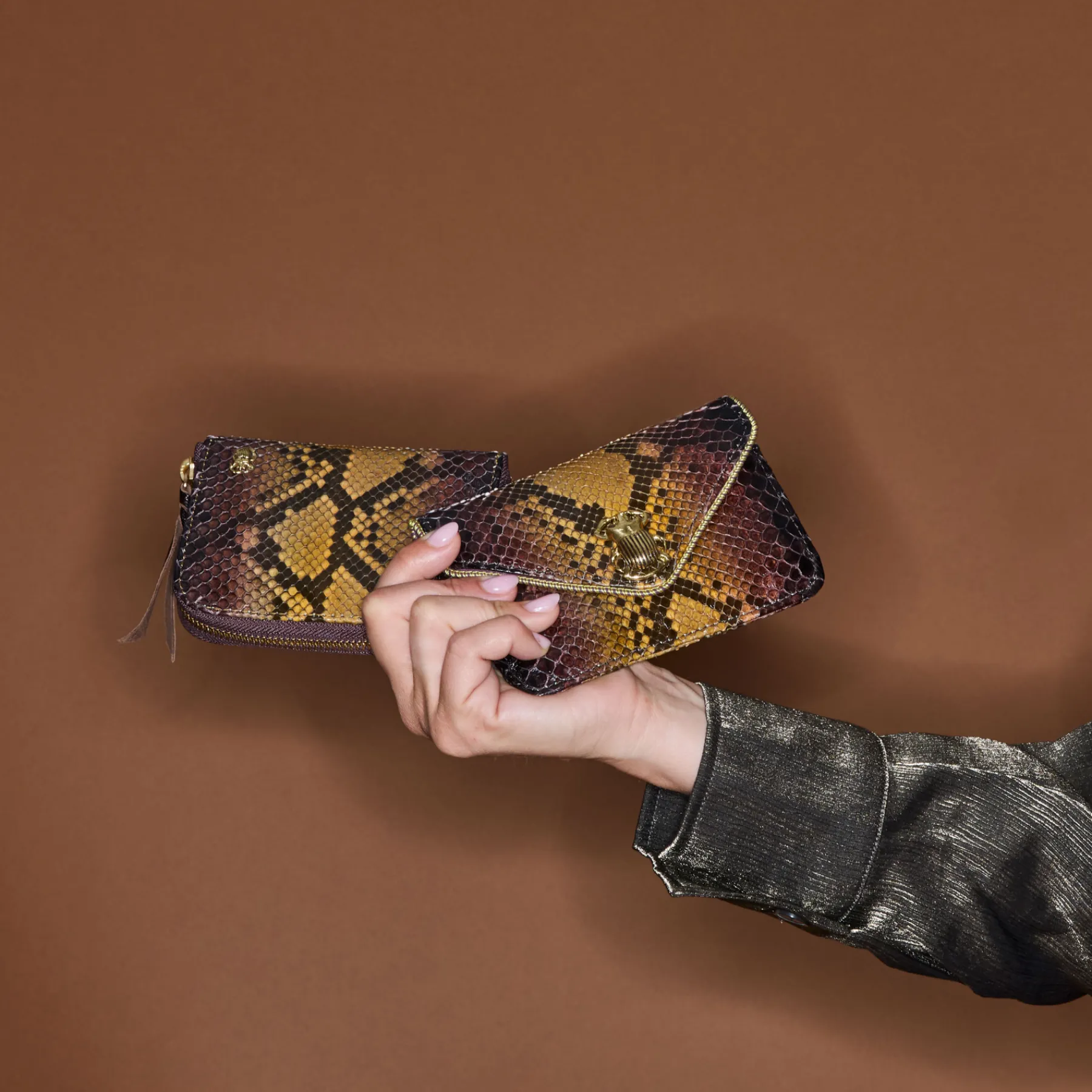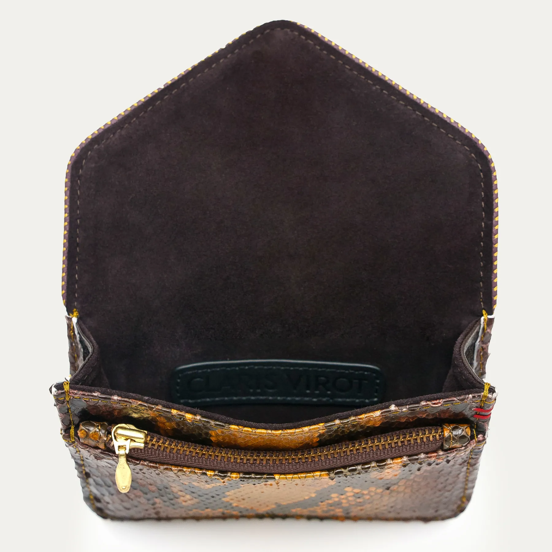 Cette petite pochette en python qui prend la forme d’une enveloppe est ornée d’un fermoir en forme de scarabée en laiton. Parfaite pour garder tous vos petits papiers et votre monnaie grâce à ses différents compartiments, elle se glissera facilement dans tous vos sacs.