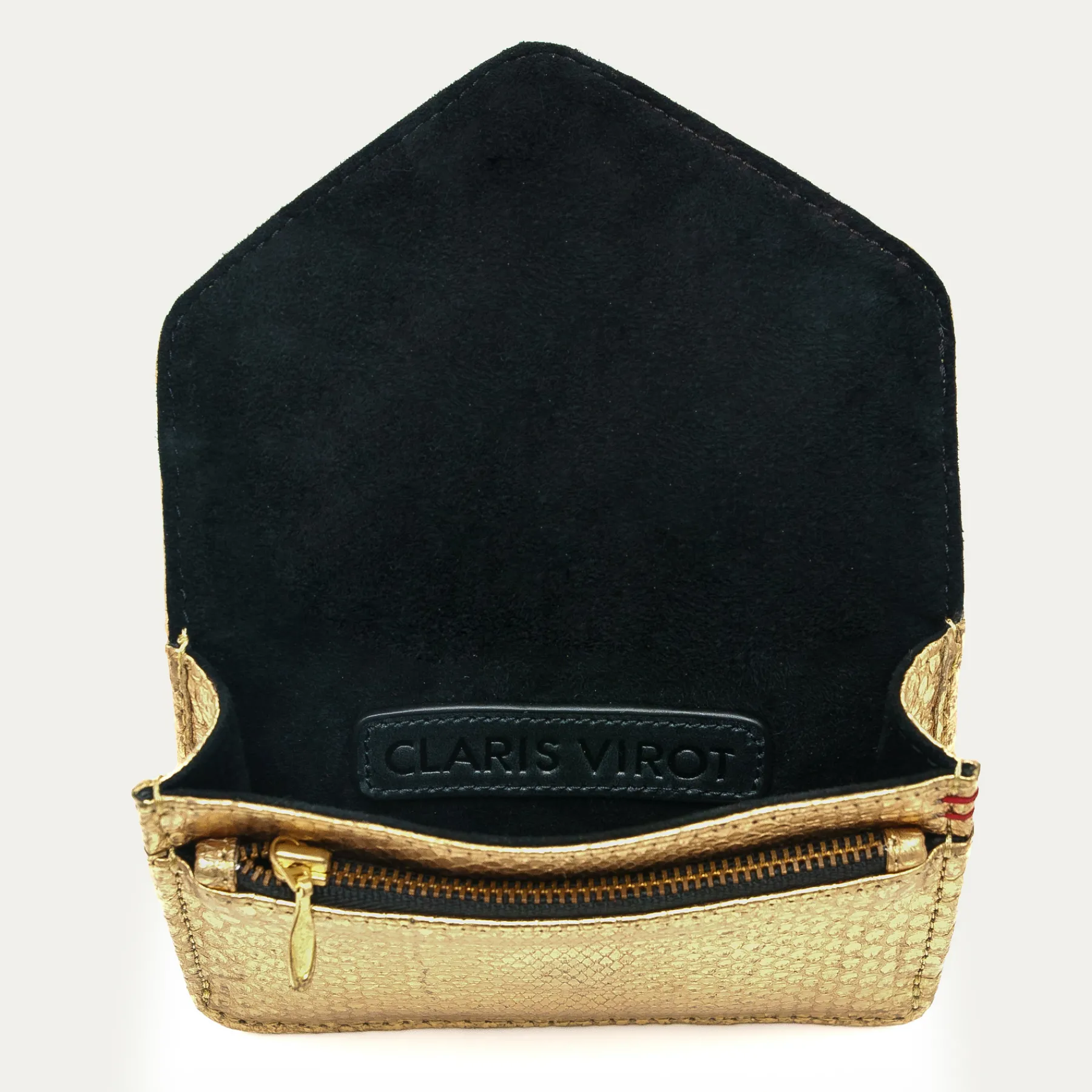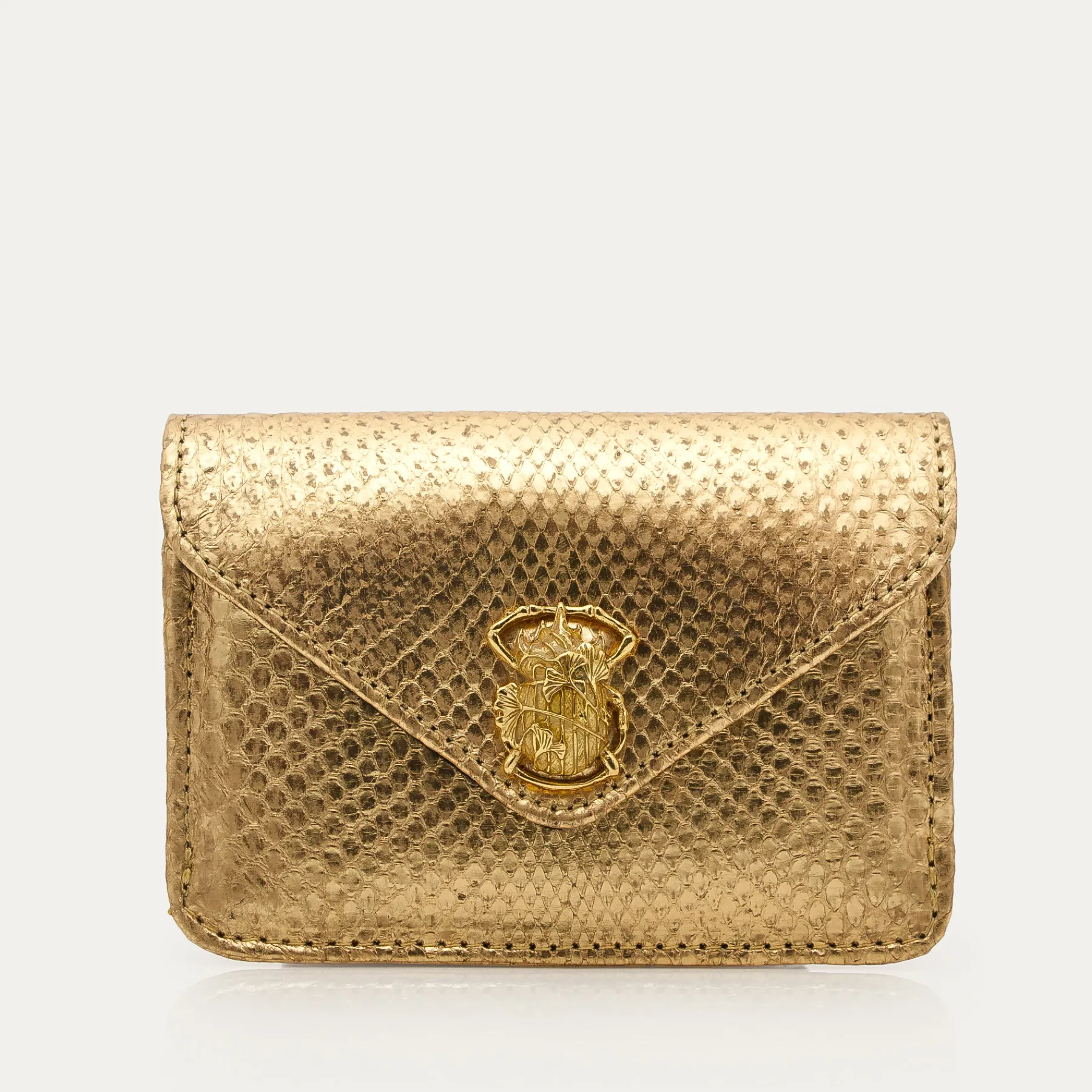 Cette petite pochette en python qui prend la forme d’une enveloppe est ornée d’un fermoir en forme de scarabée en laiton. Parfaite pour garder tous vos petits papiers et votre monnaie grâce à ses différents compartiments, elle se glissera facilement dans tous vos sacs.