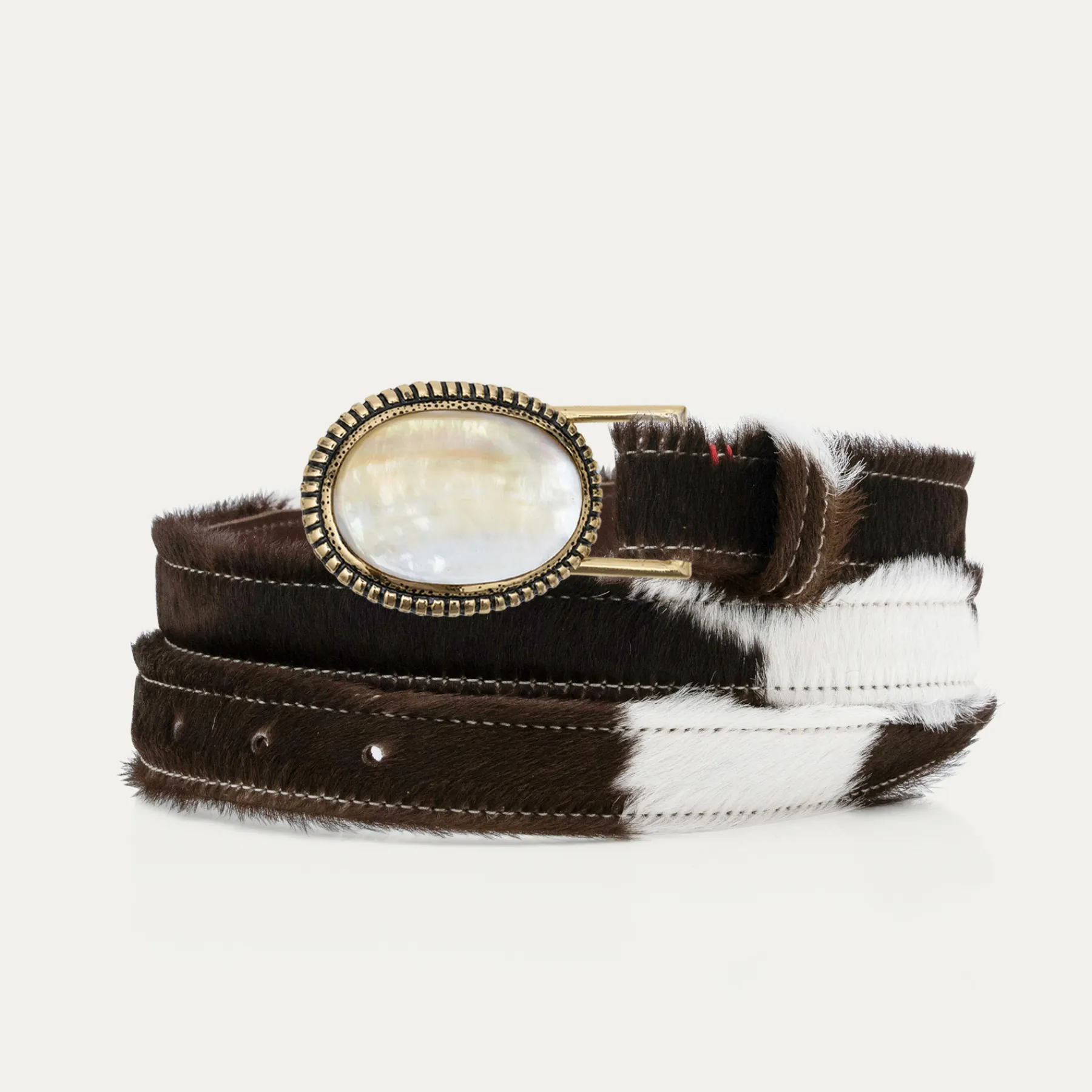 Ce ceinturon, doublé de cuir, est orné d’une magnifique boucle ovale en laiton dans laquelle est incrustée un morceau de peau assorti avec la couleur de la ceinture. Elle donne un look fort aux tenues les plus simples et se porte aussi bien sur un jean que sur une robe.