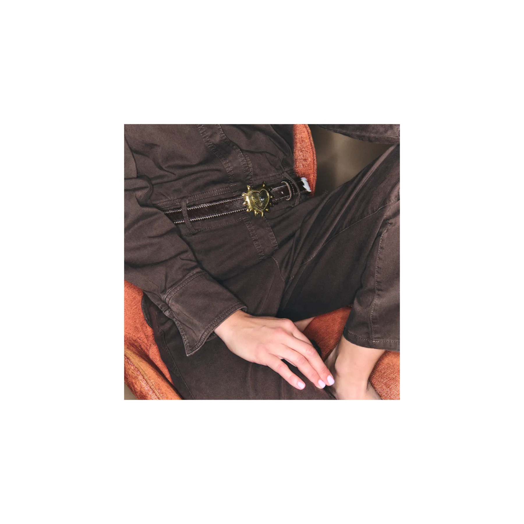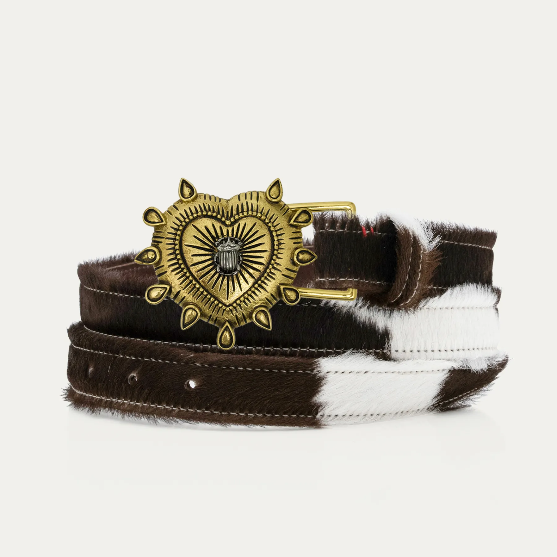 Ce ceinturon plus fin, doublé de cuir, est orné d’une magnifique boucle en laiton avec un ex-voto au milieu. Il ajoute une touche distinctive aux tenues les plus simples et se porte aussi bien sur un jean que sur une robe.